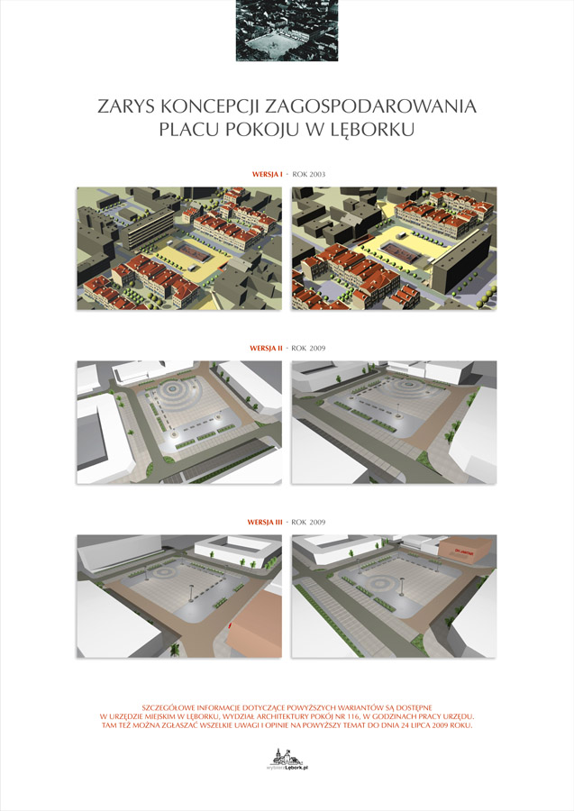 Opracowana koncepcja placu Pokoju w 3 wersjach przedstawiona została w formie plakatu, który został wywieszony w kilku miejscach - m.in. w DH „Jantar", w galerii LCK przy ul. M. Reja 28, w gablocie miejskiej koło „żabek" - w celu zapoznania się mieszkańców z istniejącymi planami.