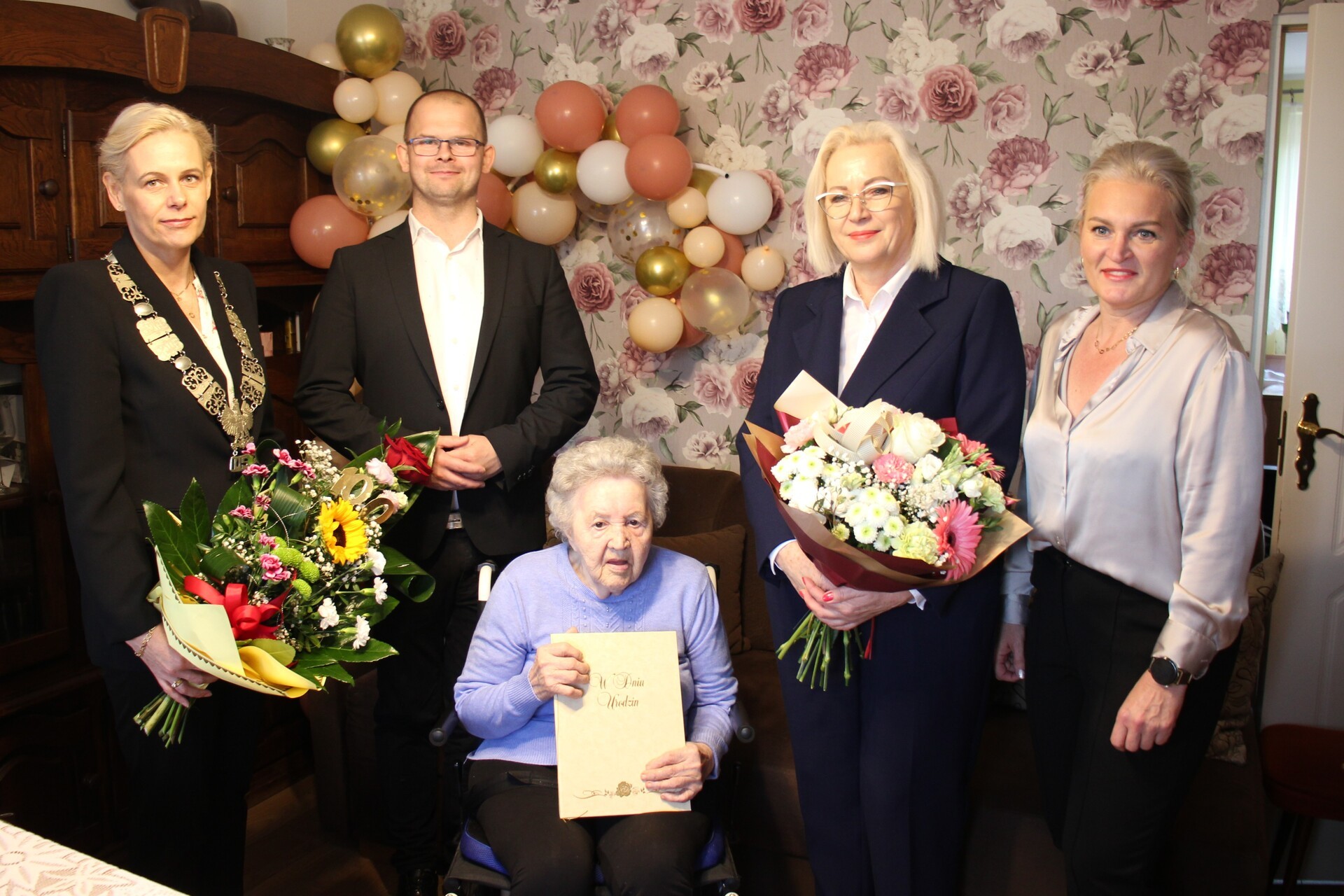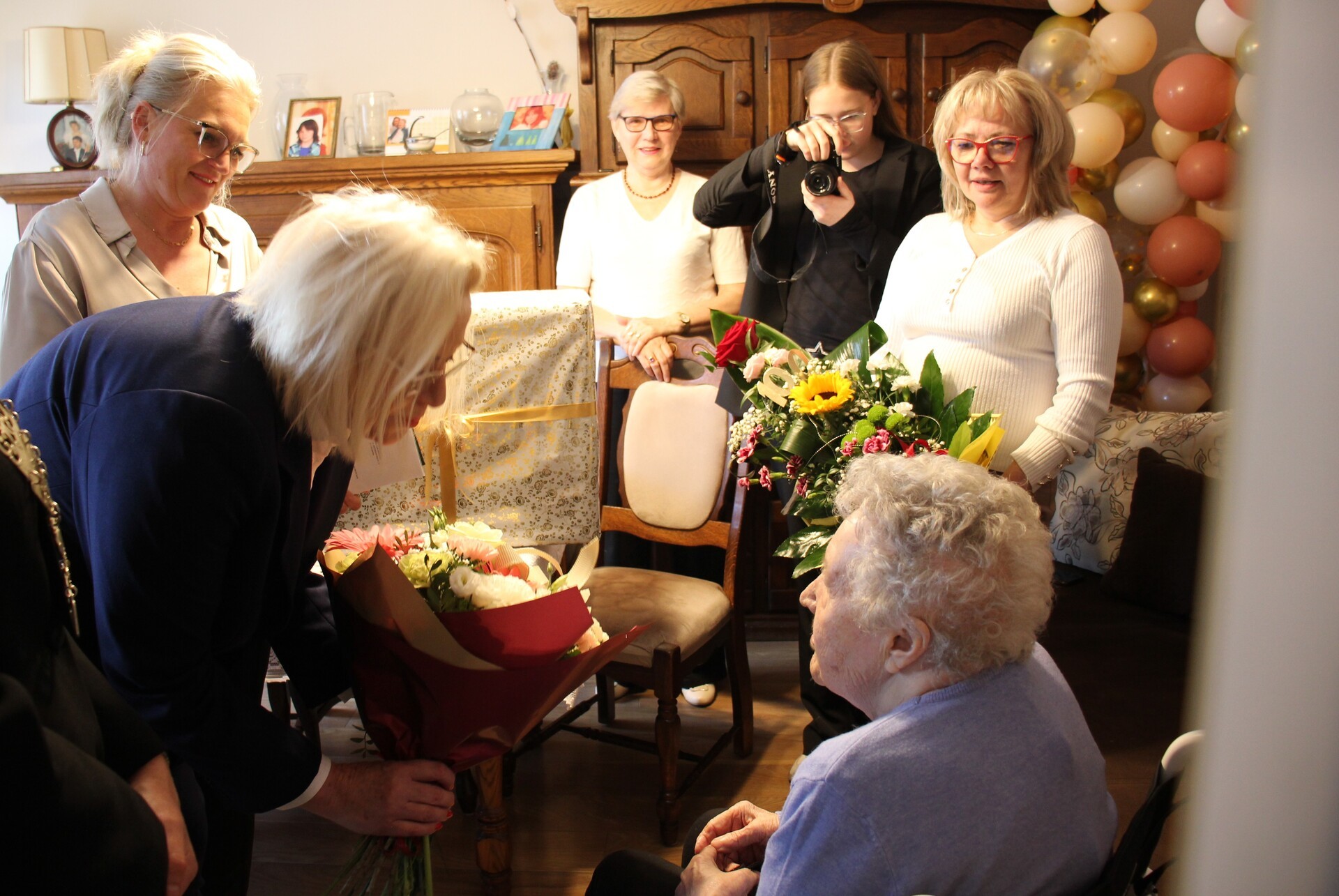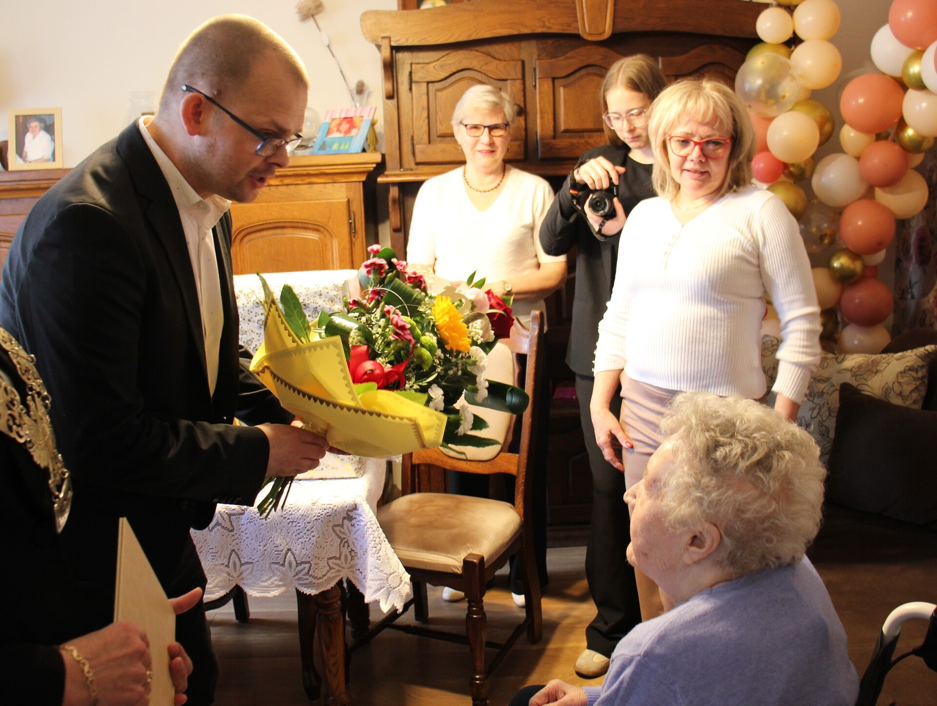 Piękny jubileusz był okazją do rodzinnego świętowania, a także do wizyty u Jubilatki burmistrza Lęborka Jarosława Litwina, kierownik Urzędu Stanu Cywilnego Krzysztofy Hirsch, kierownika lęborskiego Inspektoratu Zakładu Ubezpieczeń Społecznych Haliny Orlikowskiej i zastępcy naczelnika wydziału świadczeń ZUS Joanny Kochman. Goście złożyli Pani Józefie życzenia, przekazali kwiaty oraz jubileuszowy prezent.