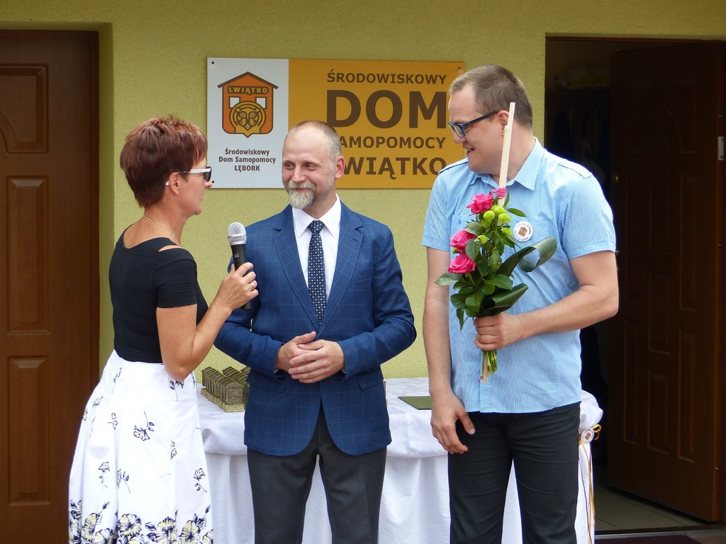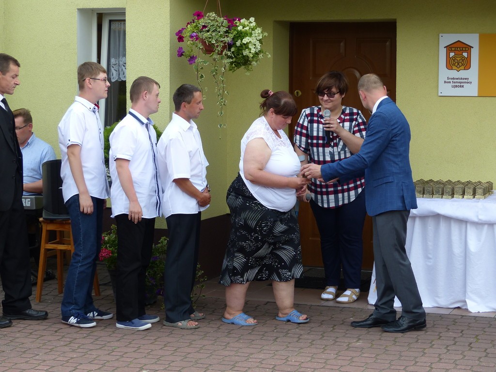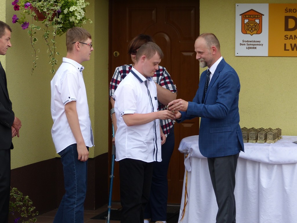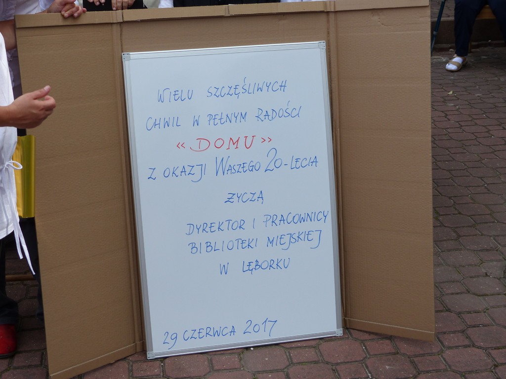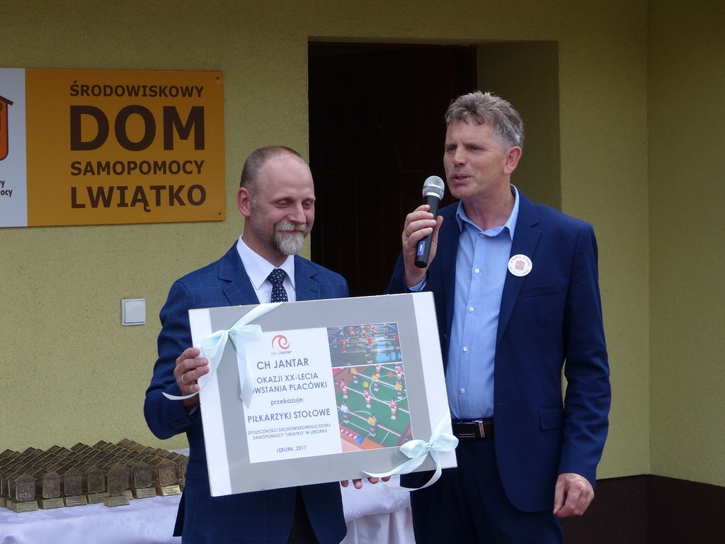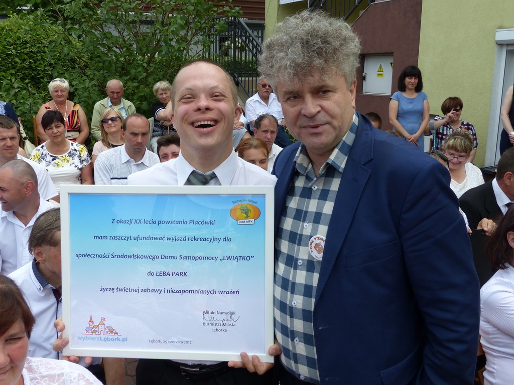 Burmistrz Lęborka Witold Namyślak, dziękując za wielką pracę i opiekę nad niepełnosprawnymi osobami, wręczył społeczności domu prezent – wycieczkę autokarową do Parku Dinozaurów w Łebie. Każdy z domowników otrzymał na pamiątkę jubileuszową statuetkę, a wszyscy mogli zostawić po sobie na pamiątkę nietypowy ślad – węzeł krzyżykowy na materiale.