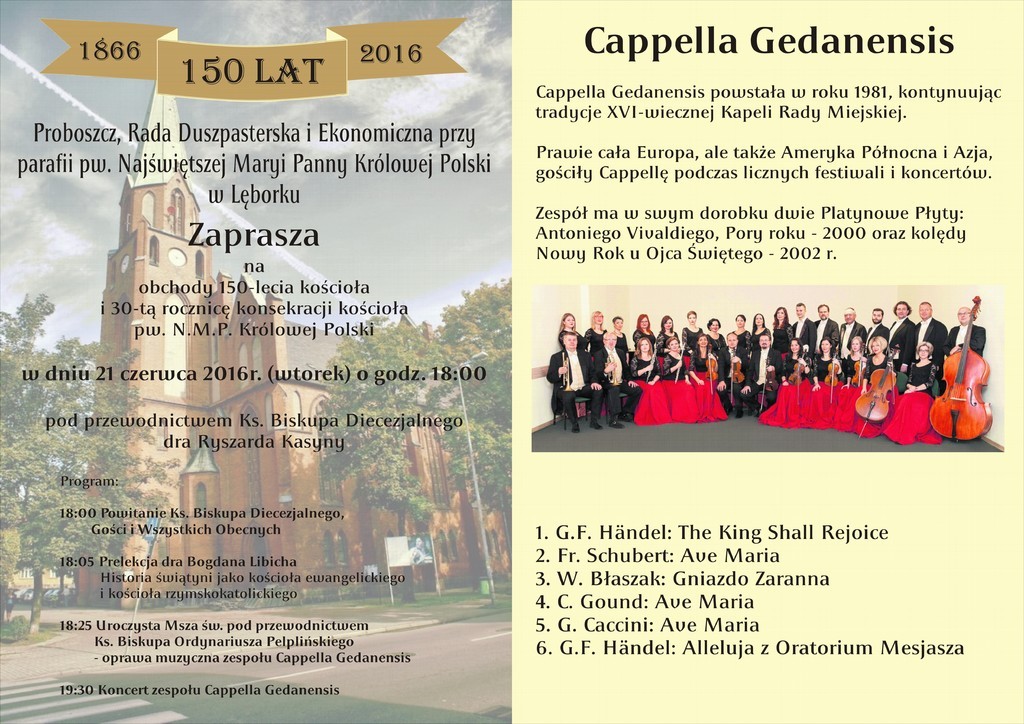 21 czerwca 2016 o godz. 18 150-lecie kościoła i 30-tą rocznicę konsekracji kościoła obchodzić będzie parafia pw. Najświętszej Maryji Panny Królowej Polski. Uroczystą Mszę Św. pod przewodnictwem Ks. Biskupa Ordynariusza Pelplińskiego Ryszarda Kasyny poprzedzi wykład dr Bogdana Libicha „Historia świątyni jako kościoła ewangelickiego i kościoła rzymskokatolickiego”. Po Mszy z koncertem wystąpi znana w wielu miejscach Europy i świata Cappella Gedanensis.