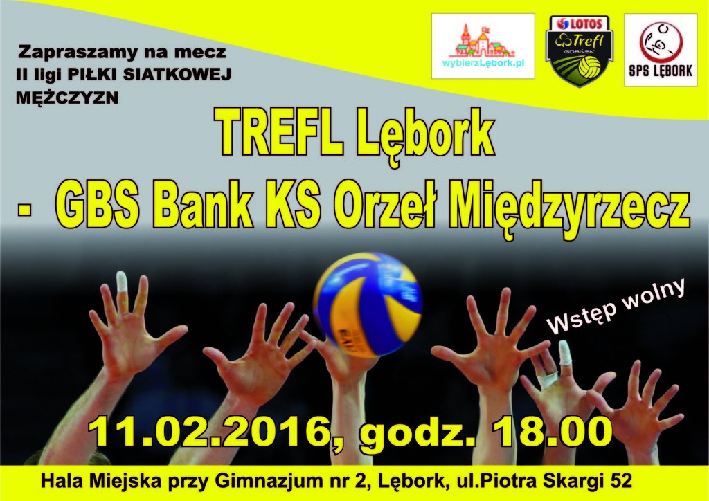 W dniu 11 lutego 2017 r. o godz. 18:00 odbędzie się mecz II ligi siatkówki mężczyzn sezon 2016/2017 Trefl Lębork. Mecz odbędzie w hali miejskiej w Lęborku przy ul. P. Skargi 52. Gospodarze będą podejmowali GBS Bank KS Orzeł Międzyrzecz. Wstęp wolny, serdecznie zapraszamy.