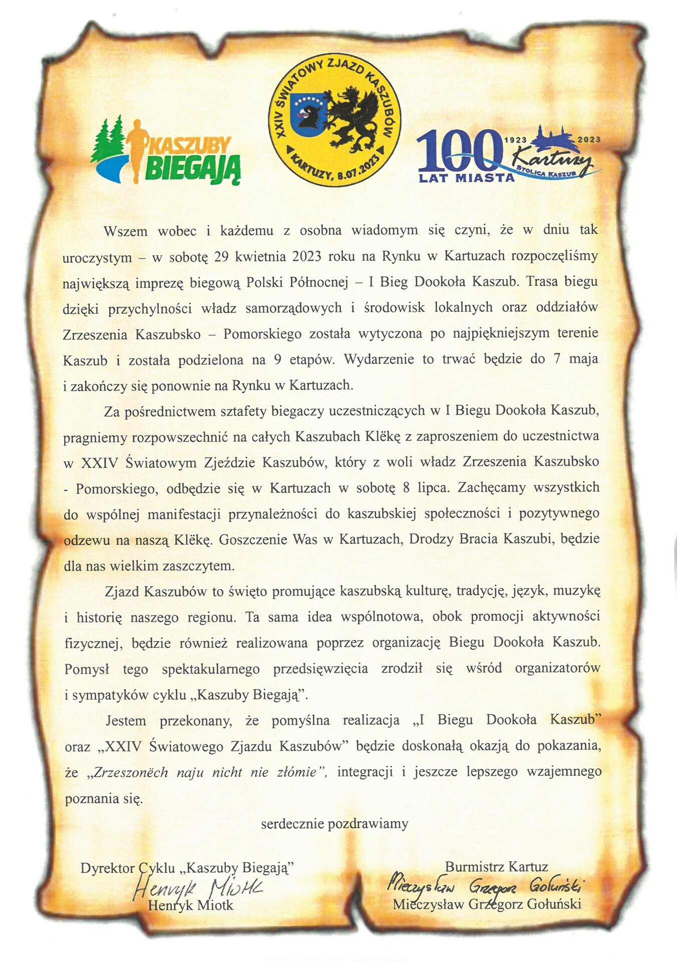 Organizator przekazał na ręce burmistrza pismo „Klekę” z informacją o Biegu oraz kolejnym zbliżającym się Zjeździe Kaszubów, który odbędzie się 8 lipca w Kartuzach.