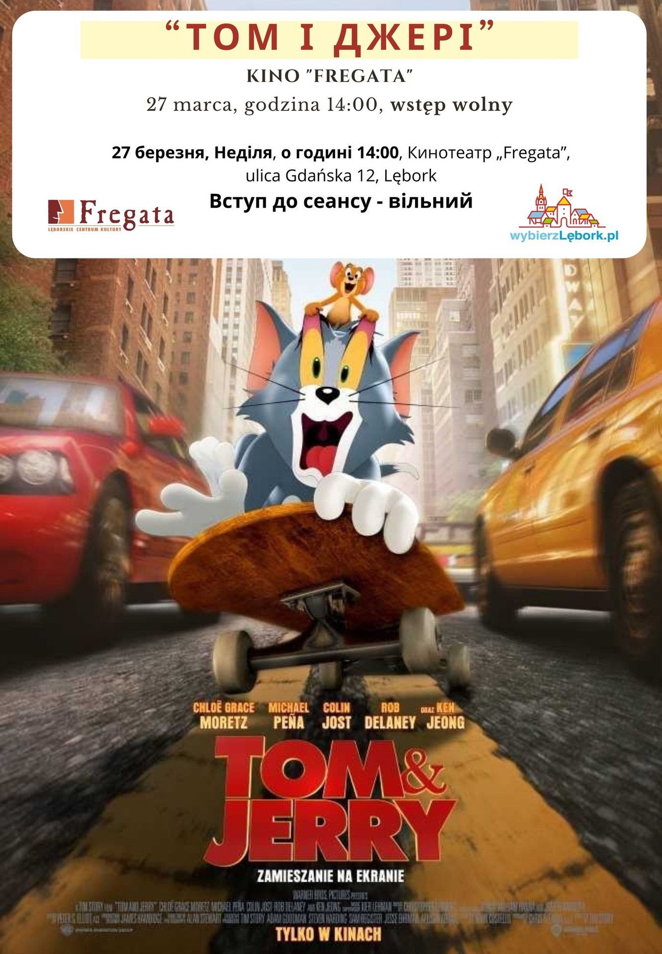 Lęborskie Centrum Kultury „Fregata” zaprasza wszystkie ukraińskie dzieci z rodzicami na film z dubbingiem w ich ojczystym języku. W niedzielę, 27 marca w kinie „Fregata” zostanie wyświetlony film pod tytułem „Tom i Jerry”. Początek seansu o godzinie 14:00. WSTĘP WOLNY. Kolejne bezpłatne seanse filmów z ukraińskim dubbingiem odbędą się w kwietniu.