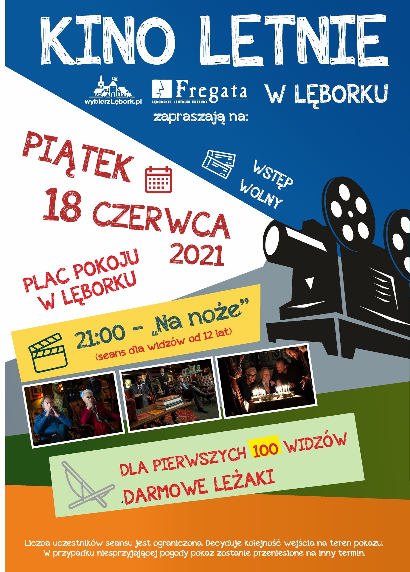 Lęborskie Centrum Kultury „Fregata” zaprasza do udziału w pierwszym w tym roku pokazie letniego kina plenerowego. W piątek, 18 czerwca 2021 roku, na Placu Pokoju odbędzie się seans komedii kryminalnej pod tytułem „Na noże”. Początek o godzinie 21:00. Dla pierwszych 100 osób gwarantujemy bezpłatne leżaki.