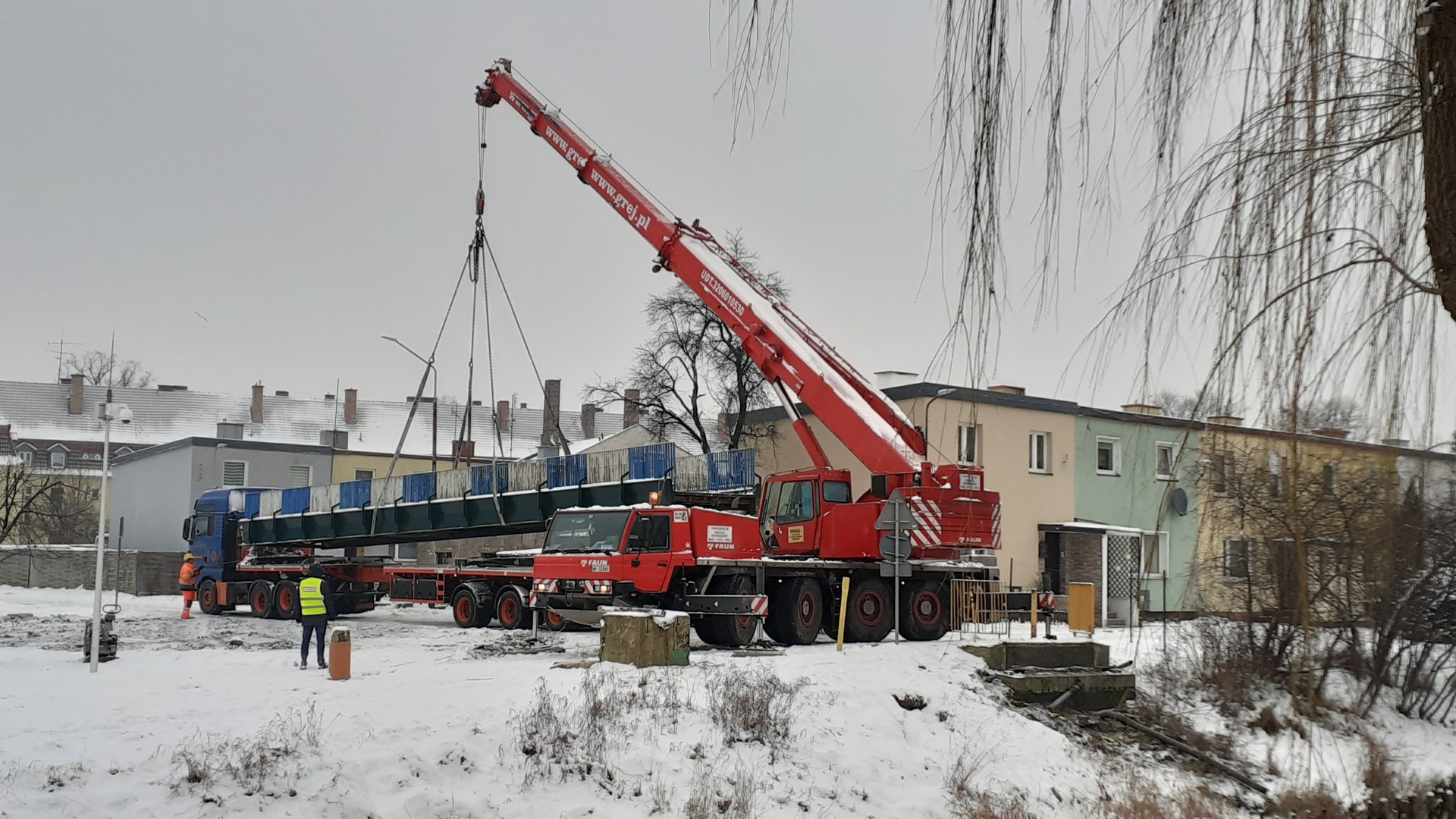 Budowa nowego mostu na rzece Łebie przy ulicach Czołgistów, Kazimierza Wielkiego i Głowackiego wkroczyła w nowy etap. We wtorek 19 stycznia br. zdemontowana została kładką dla pieszych. Zastąpi ją w połowie tego roku solidny most, dostępny także dla ruchu samochodowego. Piesi i rowerzyści w najbliższych miesiącach będą mogli skorzystać z pobliskiego mostu kolejowego. Ruch pociągów pasażerskich na trasie Lębork-Łeba-Lębork jest obecnie zawieszony. Miasto Lębork na tą inwestycję pozyskało ponad 2 mln złotych dofinansowania z Funduszu Dróg Samorządowych.