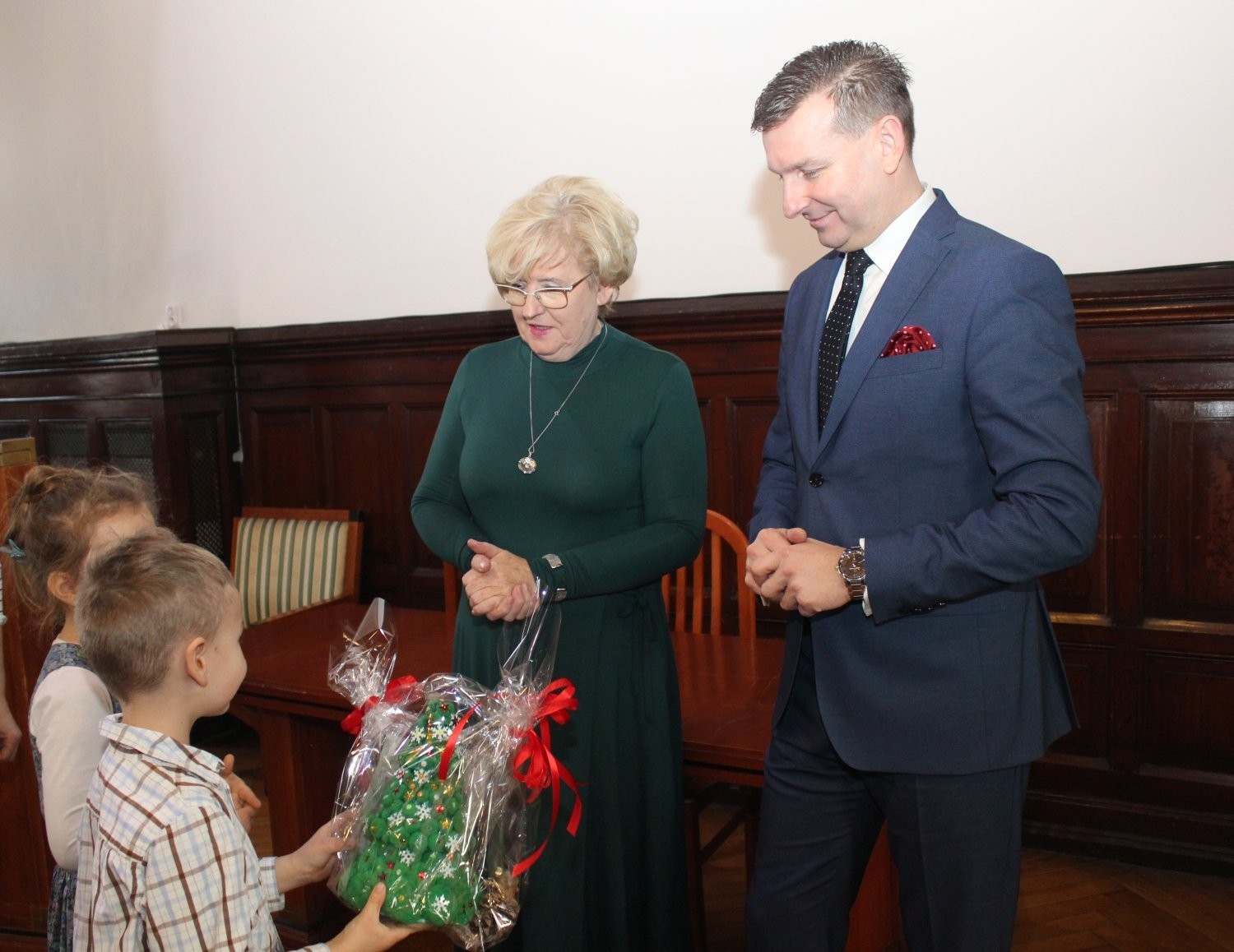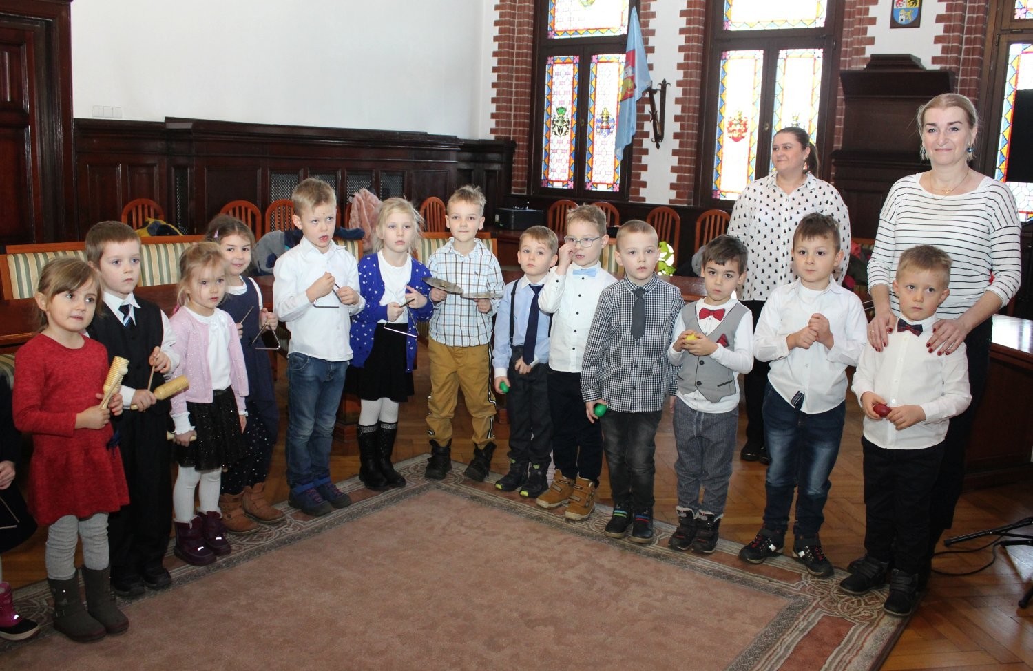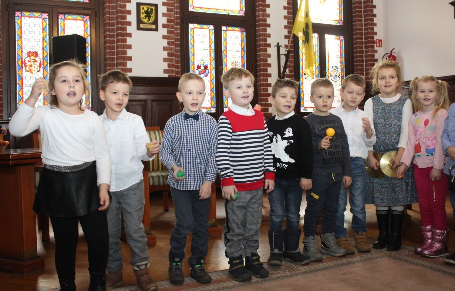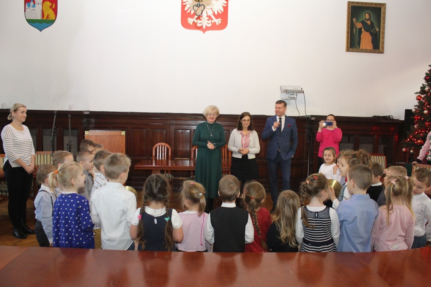 Ratusz odwiedziły przedszkolaki z grupy „Biedronki” z Przedszkola nr 9. Miłych gości przyjęła Zastępca Burmistrza Teresa Ossowska-Szara oraz Sekretarz Miasta Marian Kurzydło. Dzieci zaprezentowały układ z instrumentami do kolędy „Przybieżeli do Betlejem…” W przedszkolu w ramach zajęć dodatkowych prężnie działa koło muzyczne „Drygasy”. Przedszkolni kolędnicy wręczyli świąteczny stroik, zwiedzili zabytkowy budynek, a przy wyjściu otrzymali małe słodkości.