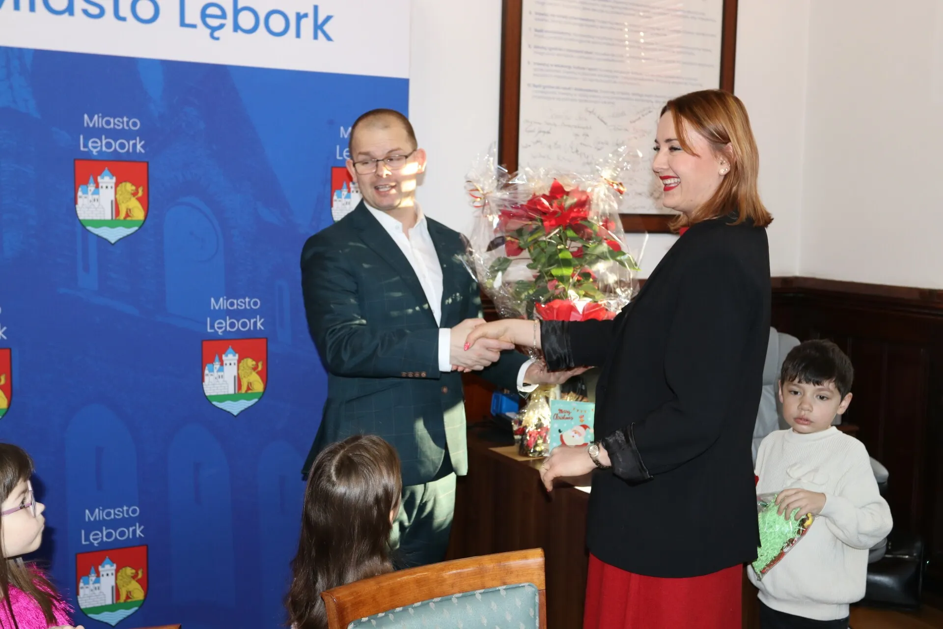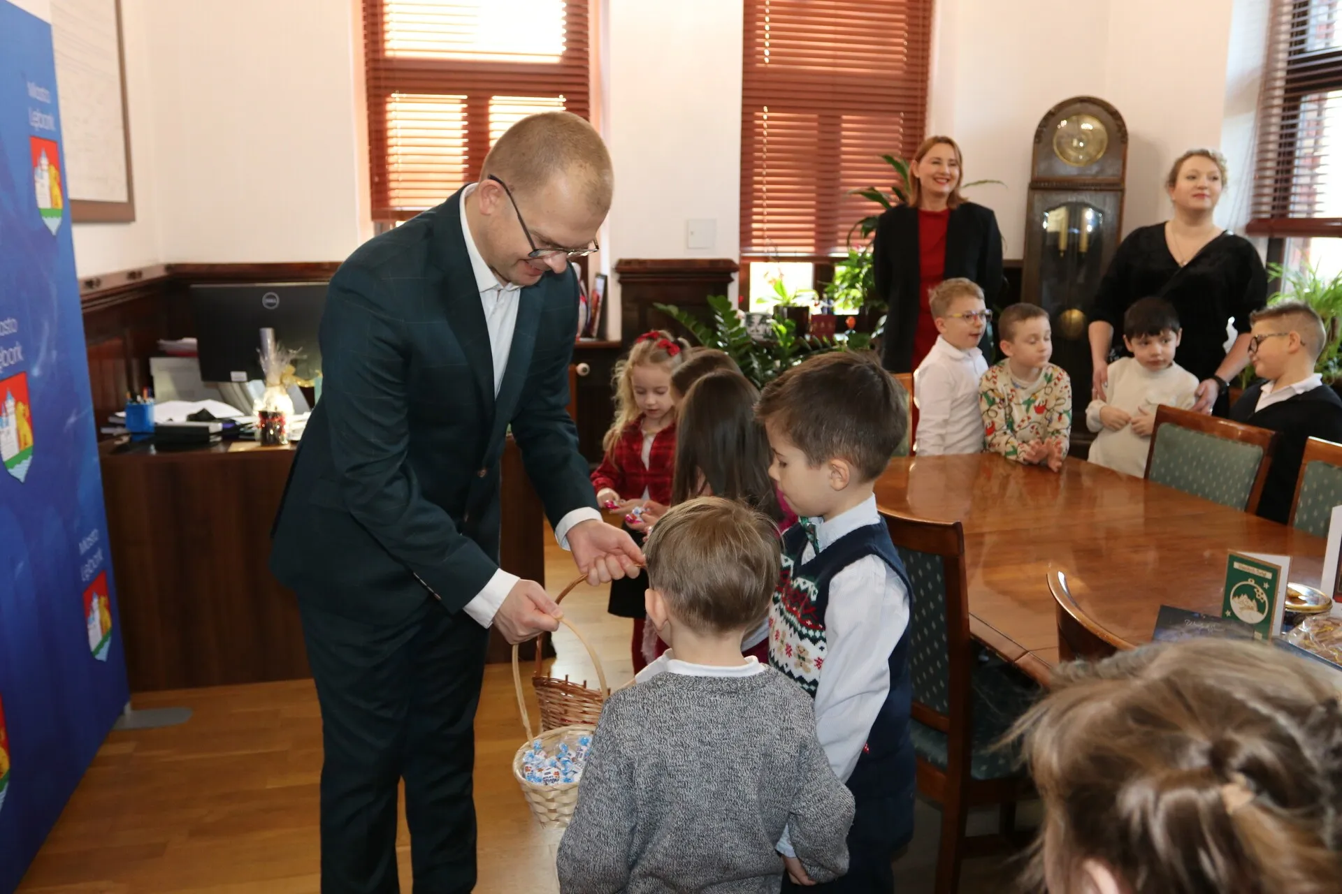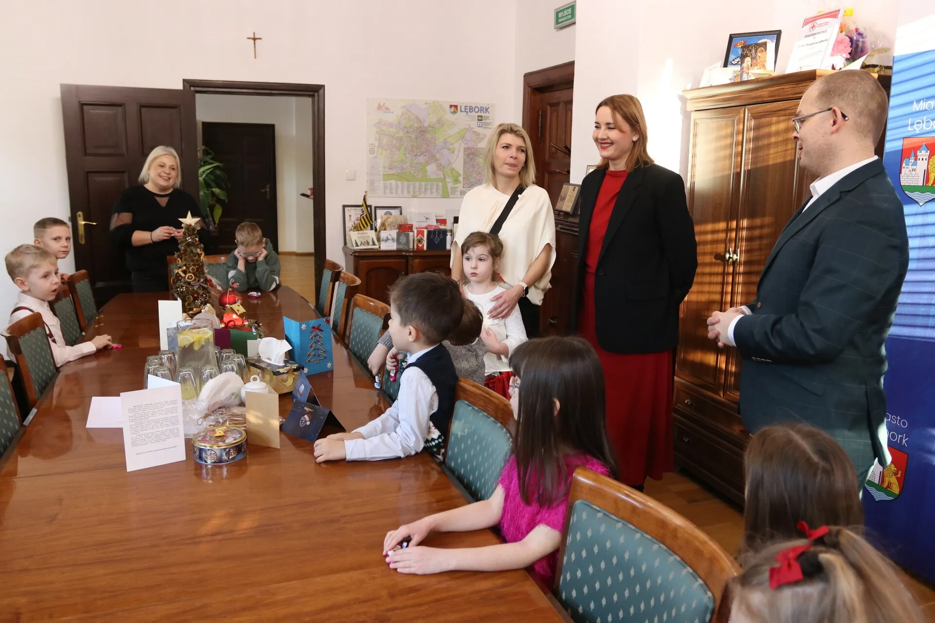 Niezwykle miłą wizytę w lęborskim ratuszu złożyły dzieci wraz z nauczycielkami z Przedszkola Integracyjnego „Jesteśmy Razem”. W ciepłej, świątecznej atmosferze burmistrz Lęborka Jarosław Litwin wspólnie z przedszkolakami zaśpiewał kolędę, a następnie poczęstował małych gości smakołykami. Burmistrz otrzymał również wyjątkowy, własnoręcznie przygotowany upominek.