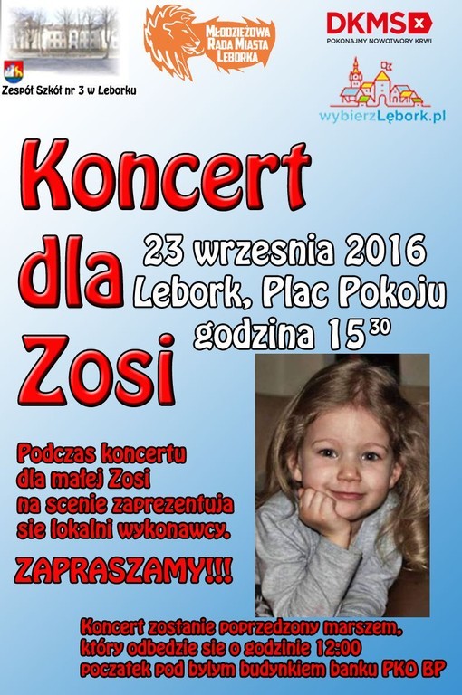 23 września br. na Placu Pokoju w Lęborku o godz. 15.30 odbędzie się koncert dla Zosi. Na scenie zaprezentują się lokalni wykonawcy.