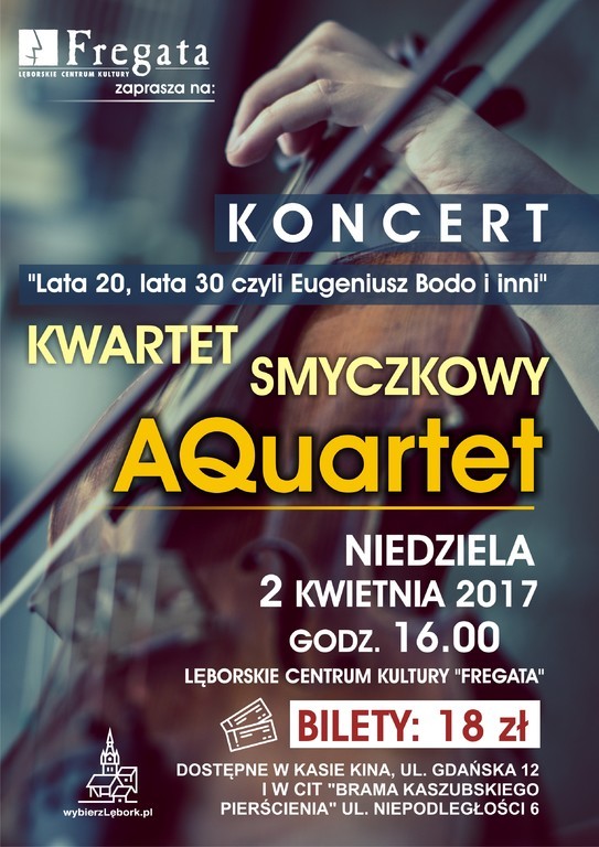 Lęborskie Centrum Kultury „Fregata” zaprasza na koncert w wykonaniu kwartetu smyczkowego AQuartet pod tytułem „Lata 20, lata 30. – Eugeniusz Bodo i inni…”. W niedzielę, 2 kwietnia, na scenie w kinie „Fregata”, będzie można usłyszeć najpiękniejsze szlagiery polskiej muzyki przedwojennej. Początek koncertu o godzinie 16.00.
