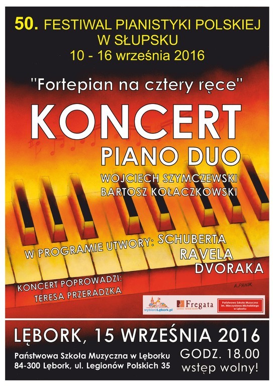 W ramach 50.Festiwalu Pianistyki Polskiej w Słupsku w dniu 15 września o godz. 18.00 w auli Państwowej Szkoły Muzycznej w Lęborku odbędzie się koncert „Fortepian na cztery ręce” w wykonaniu Wojciecha Szymczewskiego i Bartosza Kołaczkowskiego. W programie utwory Schuberta, Ravela, Dworaka. Wstęp wolny!