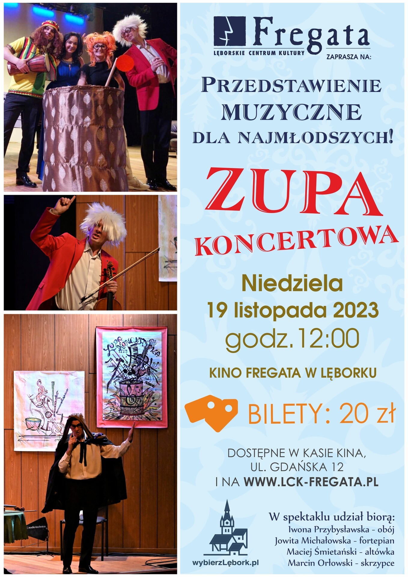 Lęborskie Centrum Kultury „Fregata” zaprasza na „Zupę koncertową”, czyli koncert umuzykalniający dla dzieci w formie przedstawienia dla całych rodzin. Ten spektakl pełen muzycznej zabawy dla najmłodszych odbędzie się w niedzielę, 19 listopada 2023 roku, w sali kina „Fregata”. Początek o godzinie 12.00.