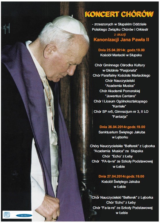 Z okazji kanonizacji bł. Jana Pawła II, chóry zrzeszone w słupskim oddziale Polskiego Związku Chórów i Orkiestr wystąpią we wspólnym koncercie z repertuarem sakralnym.