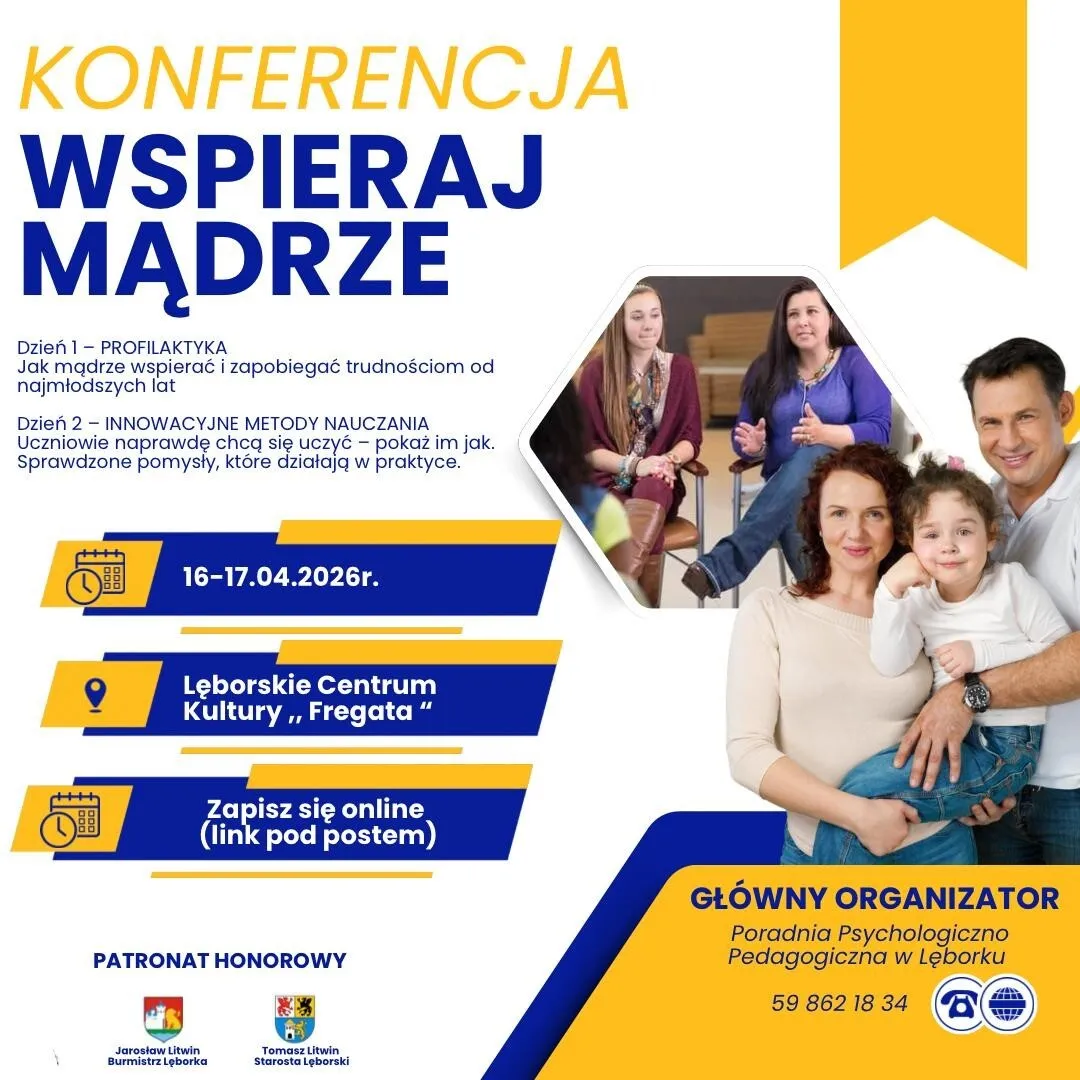 Poradnia Psychologiczno Pedagogiczna w Lęborku zaprasza dyrektorów placówek oświatowych, nauczycieli, wychowawców, pracowników socjalnych oraz wszystkie osoby pracujące z dzieckiem i rodziną do udziału w konferencji pod hasłem Wspieraj mądrze. Wydarzenie będzie okazją do pogłębienia wiedzy, wymiany doświadczeń oraz refleksji nad skutecznymi formami wsparcia dzieci i młodzieży.