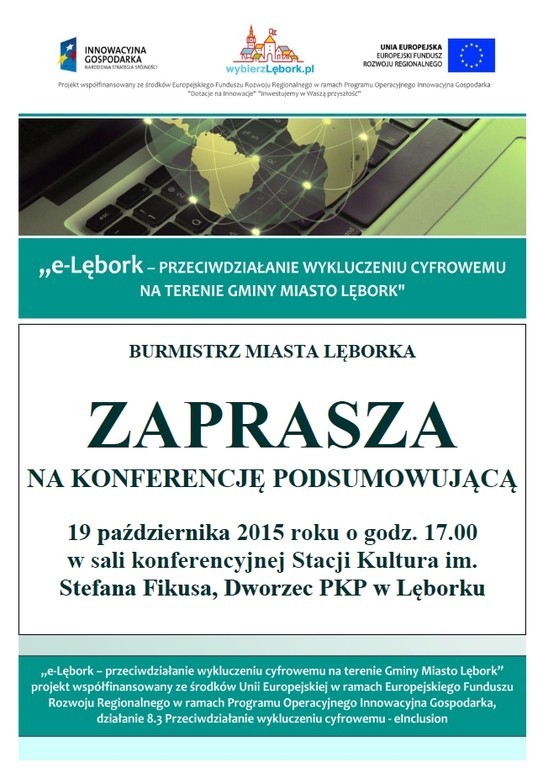 Burmistrz Miasta Lęborka zaprasza na konferencję zamykającą projekt pn. „e - Lębork - przeciwdziałanie wykluczeniu cyfrowemu na terenie Gminy Miasto Lębork” o numerze POIG.08.03.00-22-062/13 realizowanego w ramach Programu Operacyjnego Innowacyjna Gospodarka, działanie 8.3 Przeciwdziałanie wykluczeniu cyfrowemu – eInclsion, współfinansowanego ze środków Unii Europejskiej w ramach Europejskiego Funduszu Rozwoju regionalnego w dniu 19 października 2015 roku o godz. 1700 w sali konferencyjnej Stacji Kultura im. Stefana Fikusa, Dworzec PKP w Lęborku.