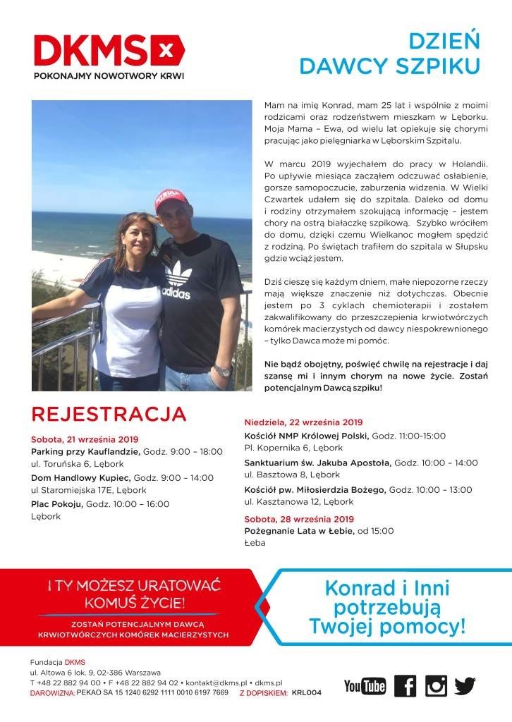 21 i 22 września w Lęborku, oraz 28 września w Łebie odbędzie się akcja rejestracji potencjalnych dawców komórek macierzystych krwi i szpiku - dla Konrada i innych pacjentów. Rodzina i przyjaciele Konrada liczą na zaangażowanie świadomej problemu, jakim jest nowotwór krwi, społeczności powiatu lęborskiego i okolic.