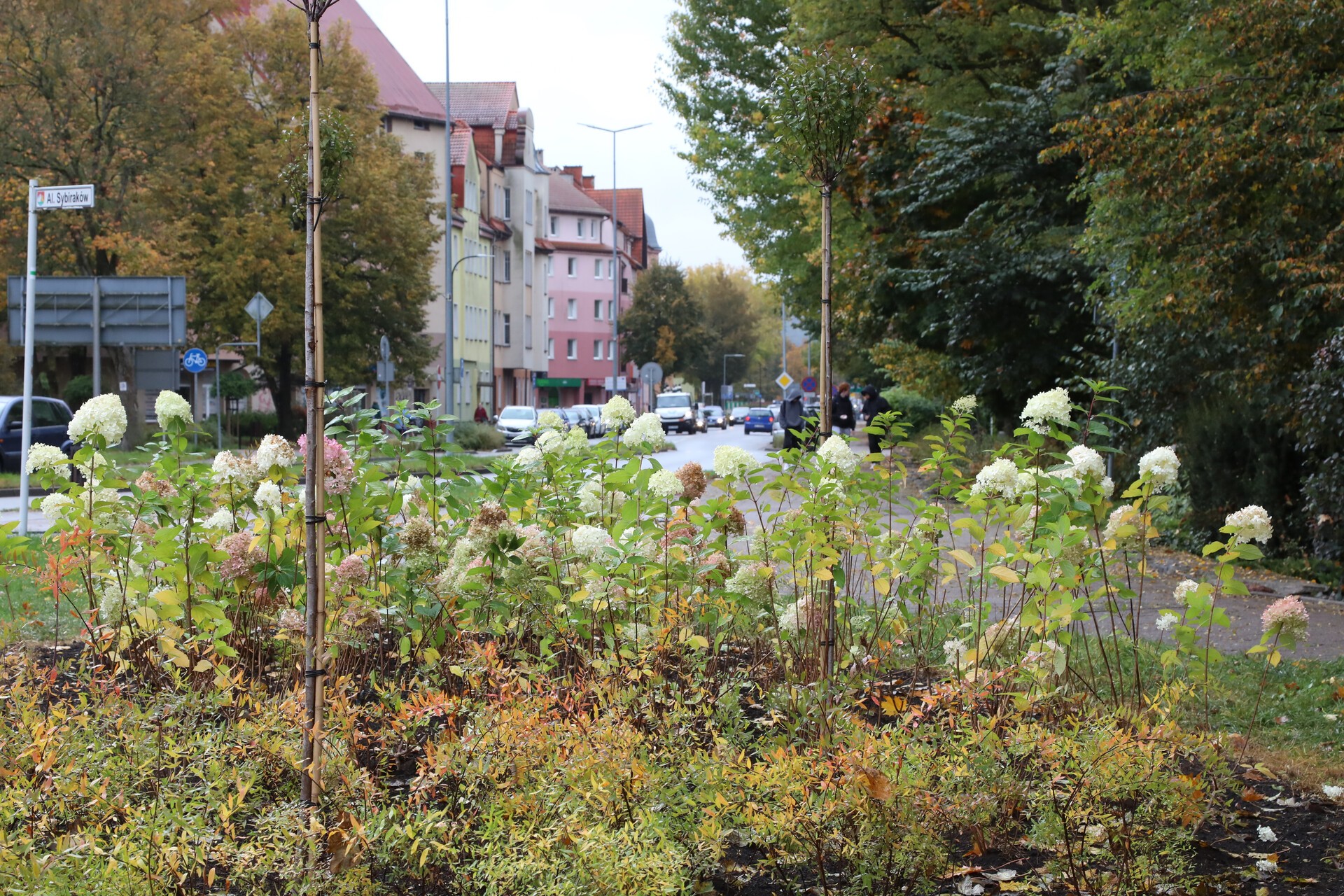 Na wysepce w pobliżu Alei Sybiraków nasadzonych zostało po kilkadziesiąt sztuk tawuły szarej, hortensji oraz trzy sztuki dekoracyjnej odmiany wiśni.