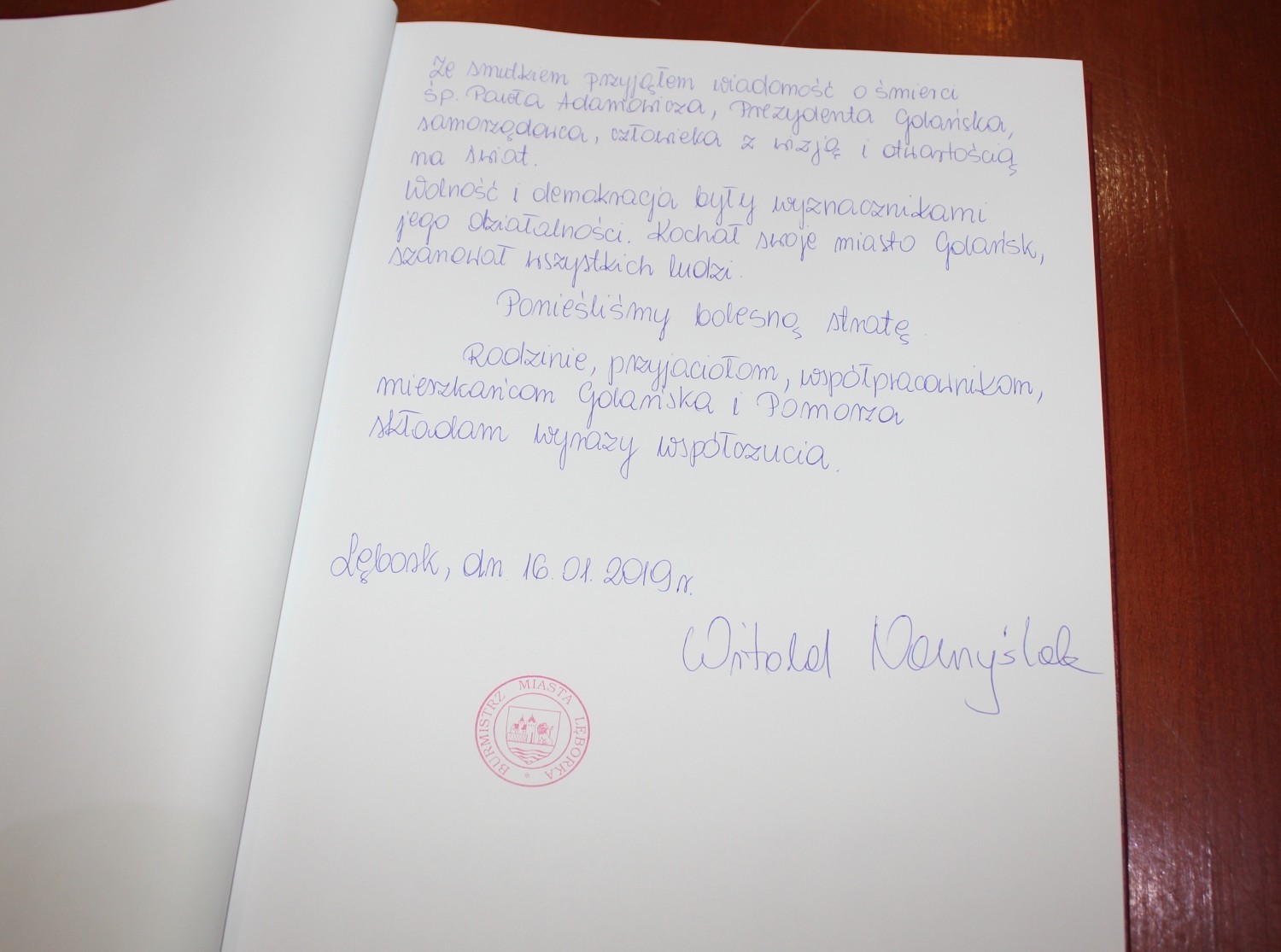Księga wystawiona jest w sali 101 (I piętro) Urzędu Miejskiego w Lęborku przy ul. Armii Krajowej 14. Wszyscy, którzy chcą w ten sposób pożegnać Pawła Adamowicza będą mogli wpisywać się do niej do piątku, 18 stycznia, od g. 9.00 do g. 17.00.
