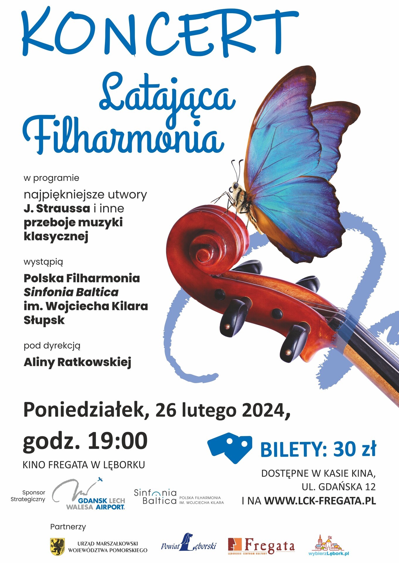 Lęborskie Centrum Kultury „Fregata” zaprasza na koncert pod tytułem LATAJĄCA FILHARMONIA w wykonaniu Orkiestry Polskiej Filharmonii Sinfonia Baltica imienia Wojciecha Kilara pod dyrekcją Aliny Ratkowskiej. W programie tego wyjątkowego spotkania z muzyką znajdą się najpiękniejsze utwory Johanna Straussa i inne przeboje muzyki klasycznej.