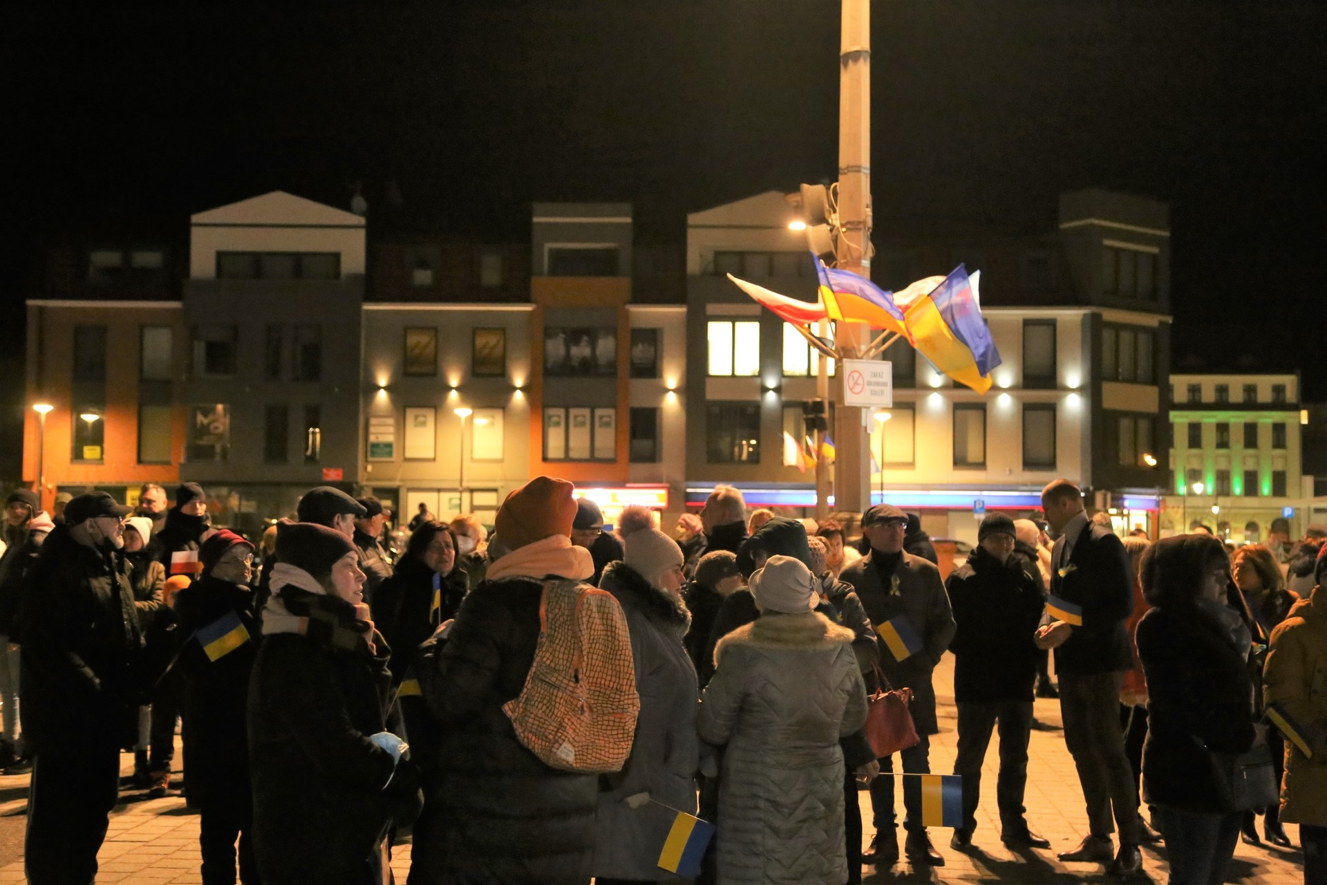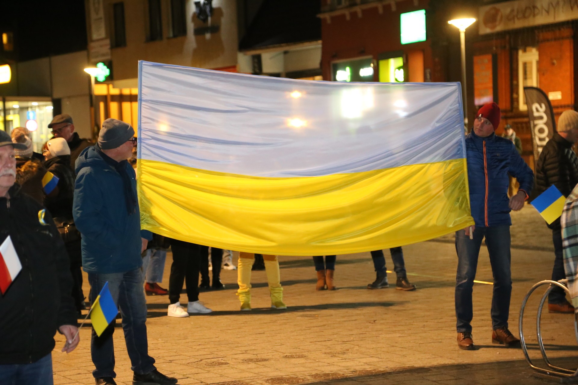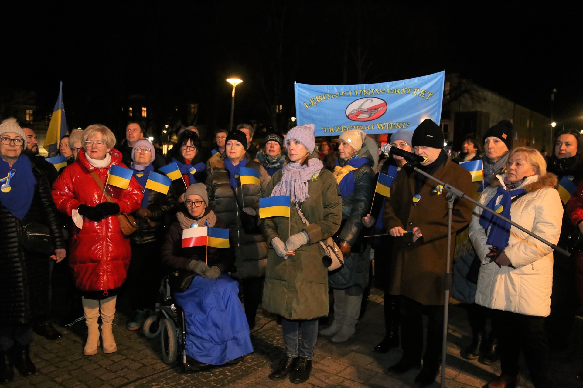 - Przyszliśmy tutaj, żeby stanąć przy Ukrainie. Żeby pokazać, że Lębork też widzi tę straszną wojnę przeciw narodowi ukraińskiemu i że chcemy pomóc. Czekamy na tych, którzy przyjadą do Lęborka, którym będziemy mogli pomóc. Nie witam dziś nikogo z racji funkcji, jakie pełni, bo dziś wszyscy jesteśmy Ukraińcami. Wszyscy stoimy na tym placu przy Ukrainie. To uchodźcy uciekający przed wojną. Zapewnimy im miejsca noclegowe. Mieszkańcy mogą też przyjąć tych ludzi do siebie. Oni mówią, że chcą być u nas na krótko, bo chcą wracać do swoich rodzin na Ukrainie – mówił do przybyłych burmistrz Witold Namyślak, zachęcając mieszkańców do wparcia sprawdzonych organizacji charytatywnych działających na rzecz pomocy Ukrainie.