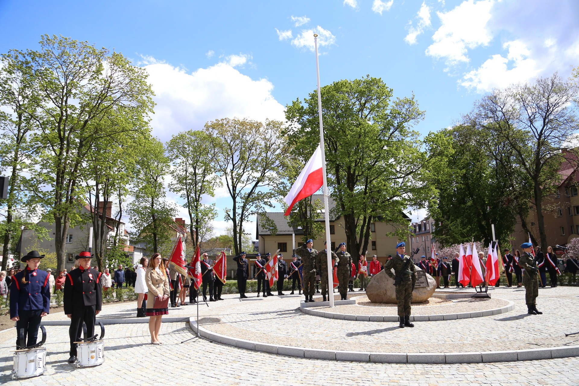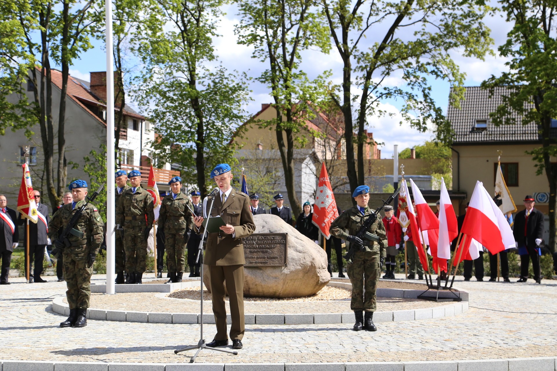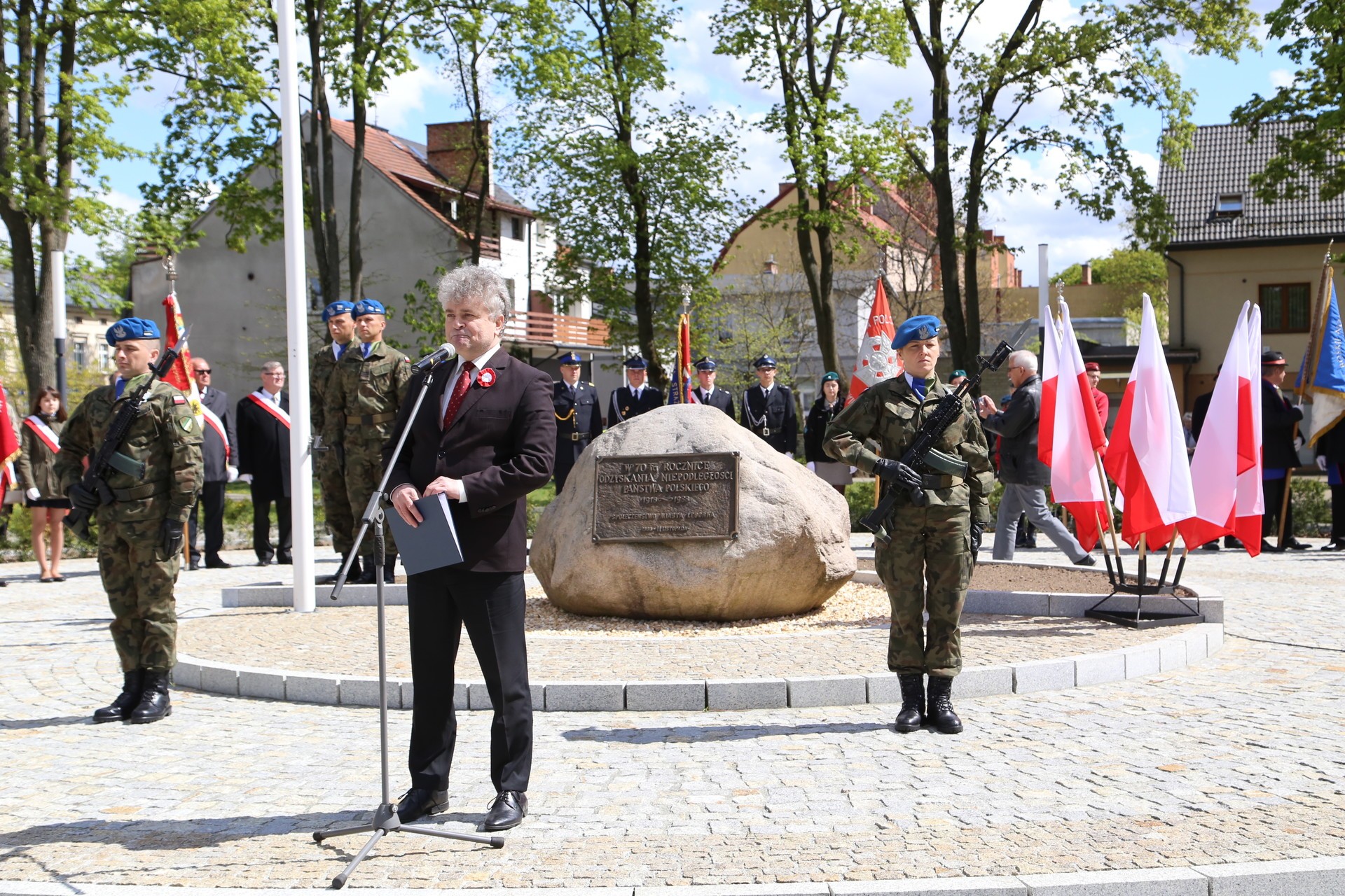 Burmistrz Miasta Witold Namyślak w swoim przemówieniu przypomniał, że pierwsza w Europie i druga na świecie po amerykańskiej konstytucja stanowi dziedzictwo wniesione w rozwój europejskiej i światowej demokracji. „W tym roku, mija równo 20 lat, od kiedy Polska, dzięki ciężkiej pracy Polaków, dzięki podjętym po 1989 roku przemianom i reformom ekonomicznym, prawnym oraz w zakresie obronności, została przyjęta do Paktu Północnoatlantyckiego, a 15 lat temu także do Unii Europejskiej – rodziny państw europejskich wyznających ten sam system wartości, wspierających się, podlegających tym samym prawom, ale i obowiązkom.”