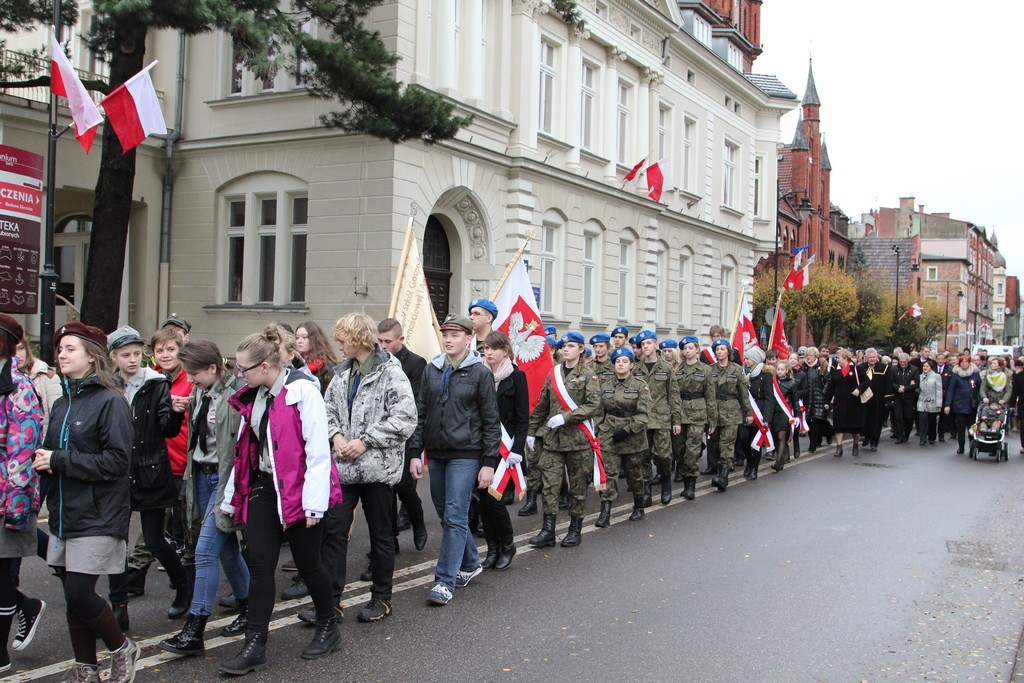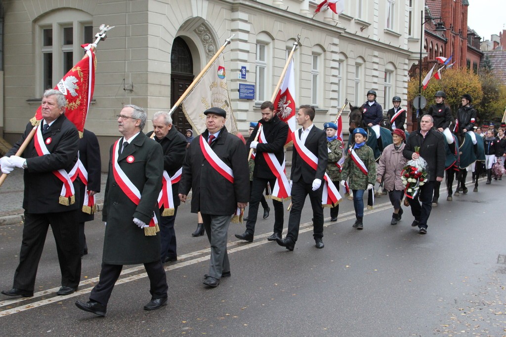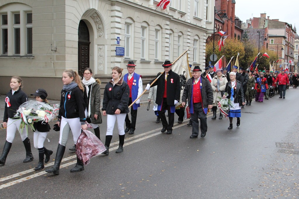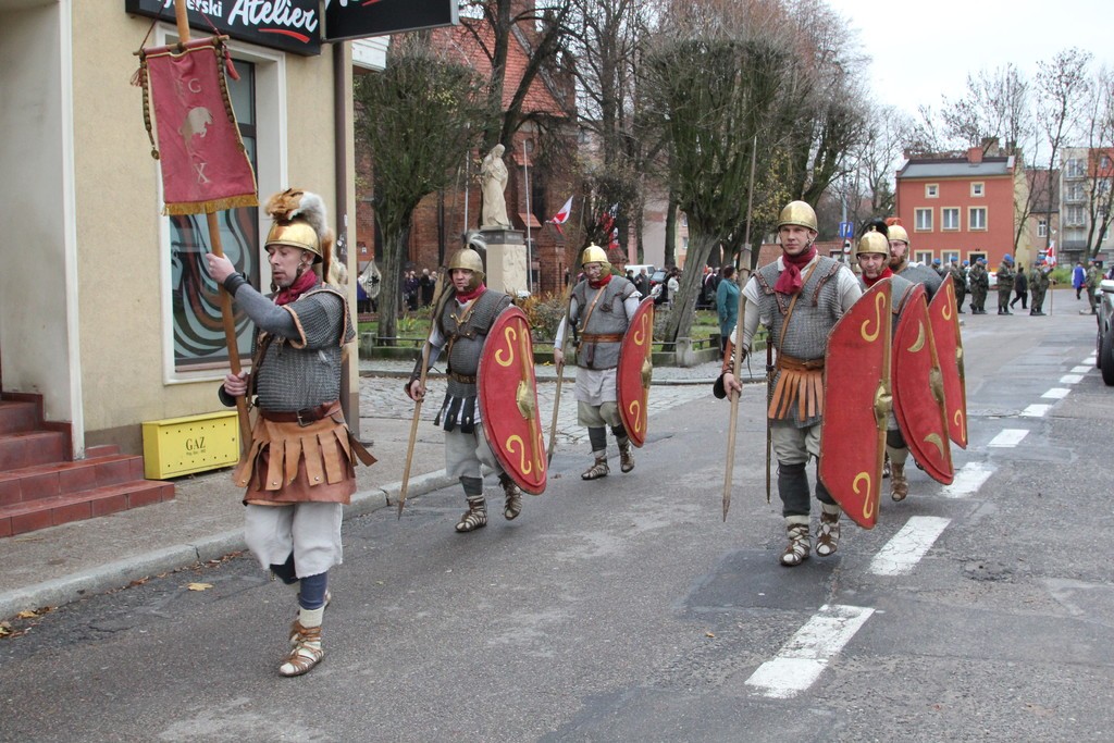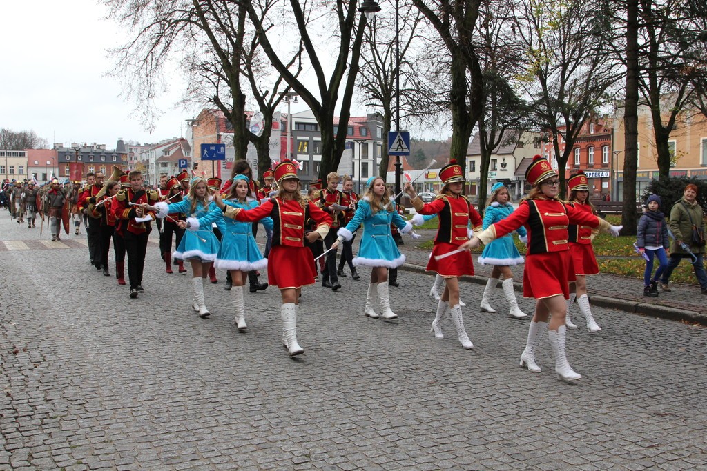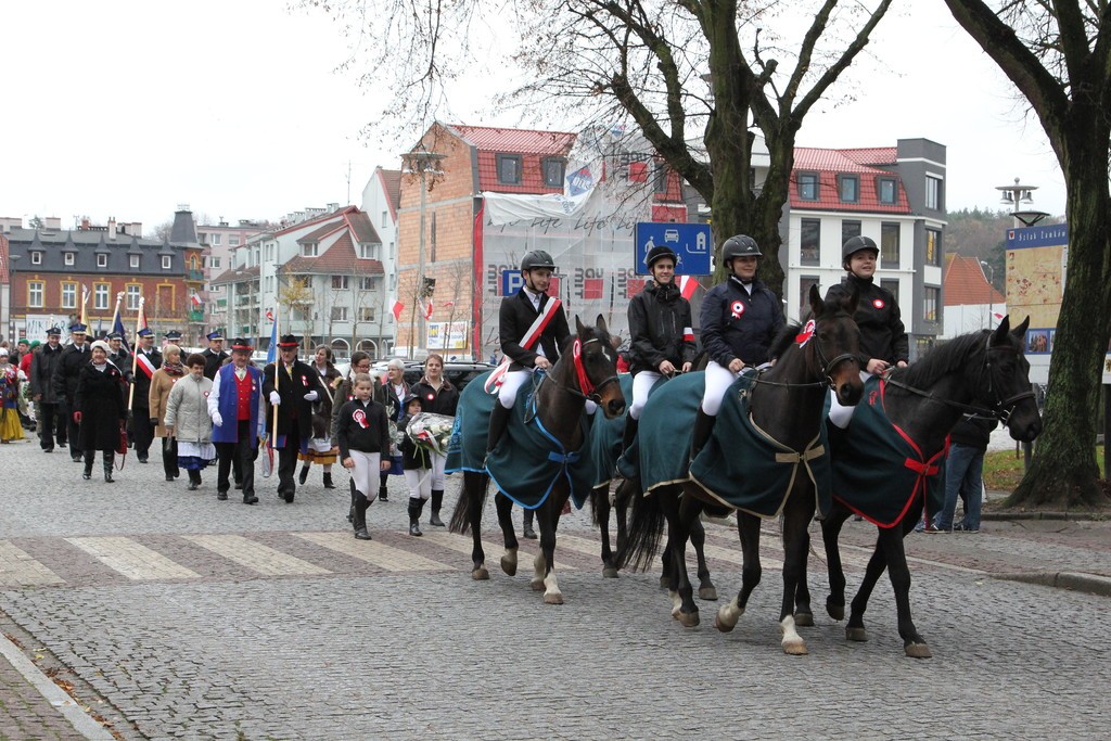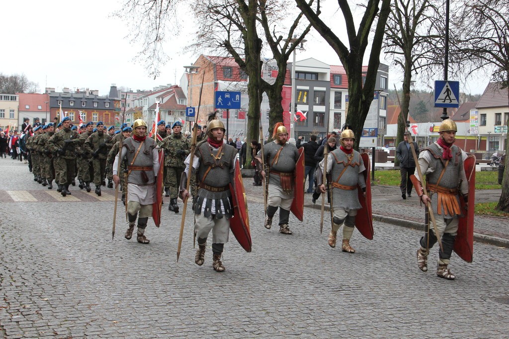 Po mszy barwny przemarsz na czele z Orkiestrą Dętą Ziemia Lęborska i kompanią honorową 1 Lęborskiego Batalionu Zmechanizowanego przeszedł ulicami miasta pod Obelisk Niepodległości. Licznie wzięły w nim udział poczty sztandarowe, kombatanci, harcerze, przedstawiciele władz samorządowych, służb mundurowych, miejskich spółek, firm, instytucji, organizacji pozarządowych i szkół. Szczególnie barwnie prezentowali się jeźdźcy ze Stajni Pałac Runowo oraz grupy rekonstrukcyjne (m. in. oddział rzymskich legionistów i lęborskich łuczników).