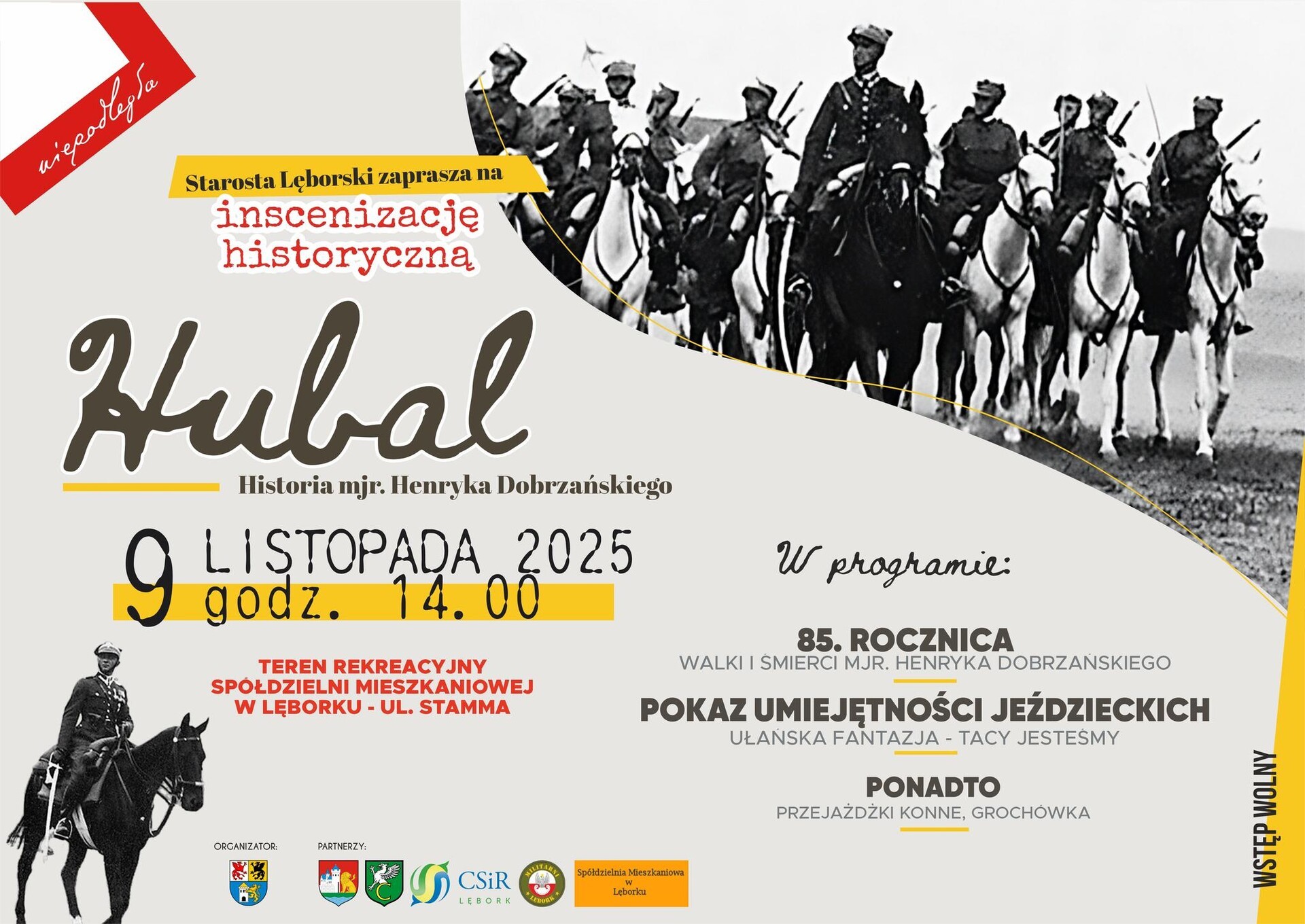 W ramach obchodów Narodowego Święta Niepodległości Starosta Lęborski zaprasza na plenerowe widowisko historyczne pt. „Hubal. Historia mjr. Henryka Dobrzańskiego”. Wydarzenie odbędzie się w niedzielę, 9 listopada 2025 r. na terenie przy ul. Stamma, na os. Sportowa. Początek widowiska o godz. 14. Miasto Lębork jest współorganizatorem wydarzenia.
