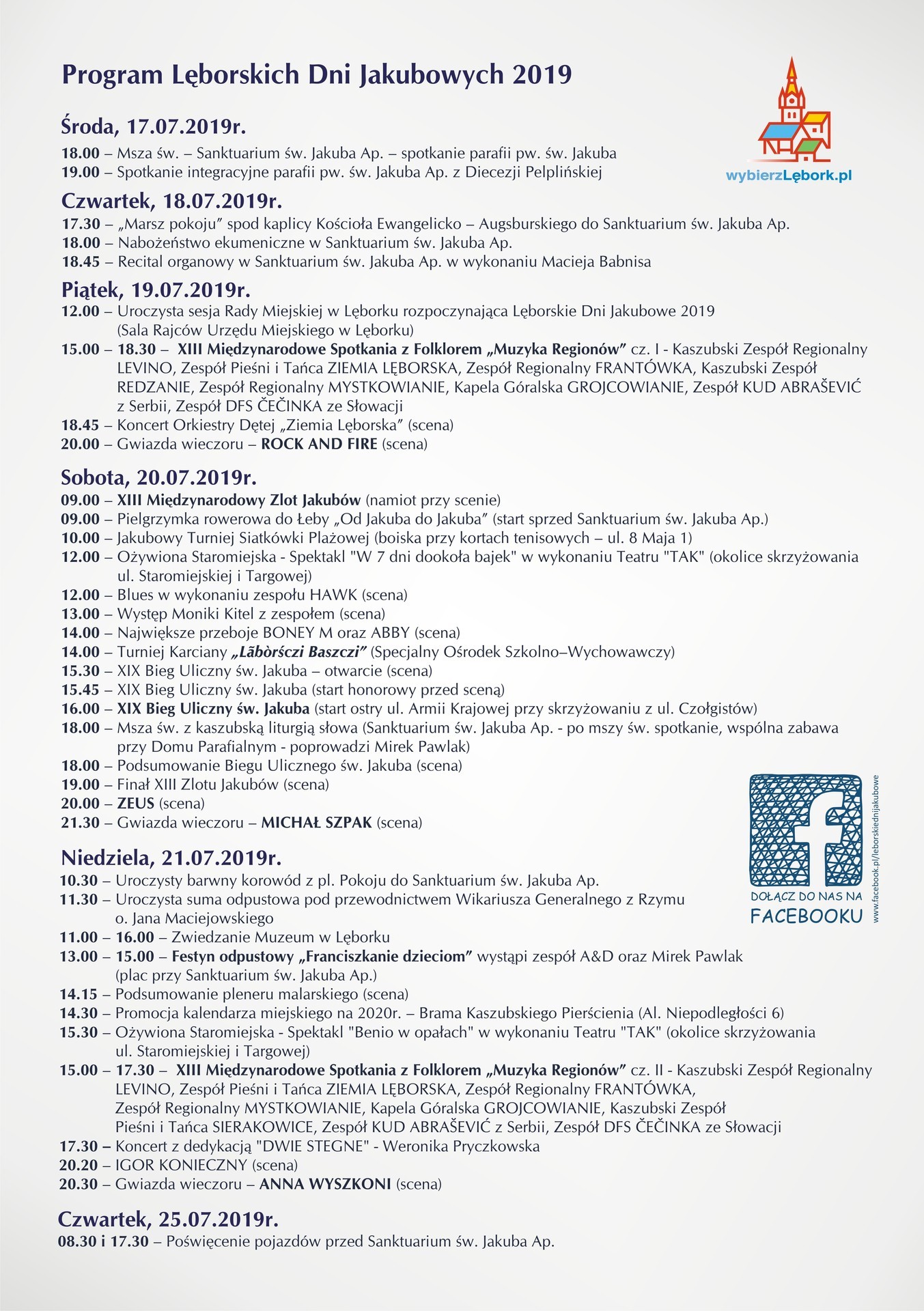 Po raz 13. odbędzie się Festiwal - Międzynarodowe Spotkania z Folklorem „Muzyka Regionów”. Niezmiennie popularny wśród Jakubów jest Międzynarodowy Zlot Jakubów, który jak zawsze odbędzie się w sobotę 20 lipca. Również w sobotę przeprowadzony zostanie XIX Bieg Uliczny św. Jakuba na dystansie 10 km. W ubiegłych latach ulicami Lęborka biegło po kilkuset zawodników.