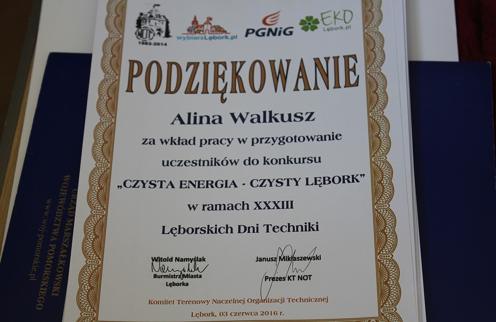 Ważną częścią spotkania było ogłoszenie wyników i wręczenie nagród konkursu „Czysta energia – Czysty Lębork”, w którym wzięła udział liczna grupa dzieci i młodzieży z powiatu lęborskiego (300 prac). Tematyka konkursu opierała się na pokazaniu korzyści wynikających ze zmiany systemu ogrzewania na bardziej przyjazne dla środowiska (ogrzewanie ekologiczne) przeciwstawiające się systemowi grzewczemu opartemu na spalaniu paliw stałych, a także z zastosowania kolektorów słonecznych, ogniw fotowoltaicznych, pomp ciepła itp. Komisja w składzie przedstawiciel KT NOT p. Krystyna Komadowska oraz pracownicy Wydziału Ochrony Środowiska Urzędu Miejskiego p. Agnieszka Kozłowska i Marlena Małachowicz, wyróżniła w czterech kategoriach wiekowych 55 uczestników oraz opiekunów przygotowujących dzieci do konkursu. Nagrody ufundowane przez PGNiG Obrót Detaliczny i Urząd Miejski w Lęborku wręczał Burmistrz Witold Namyślak.
