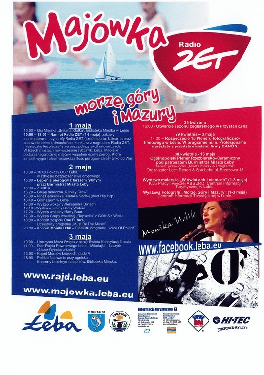 W dniach 1-3 maja w Łebie odbędzie się Majówka z Radiem ZET. W programie konkursy z nagrodami od Radia Zet, miasteczko bezpieczeństwa, pokazy akcji ratowniczych, występy wokalne, plener fotograficzno-filmowy oraz rzeźbiarsko-ceramiczny, wystawy i wiele innych atrakcji.