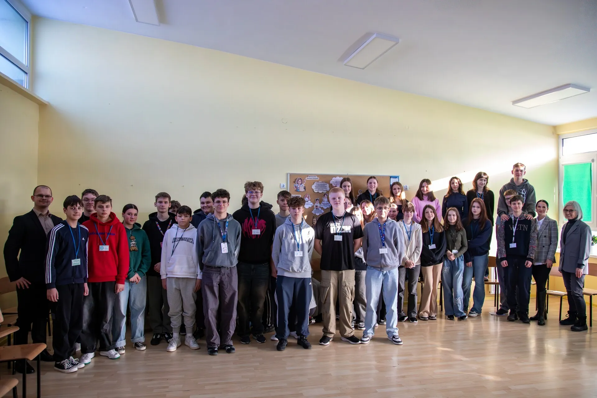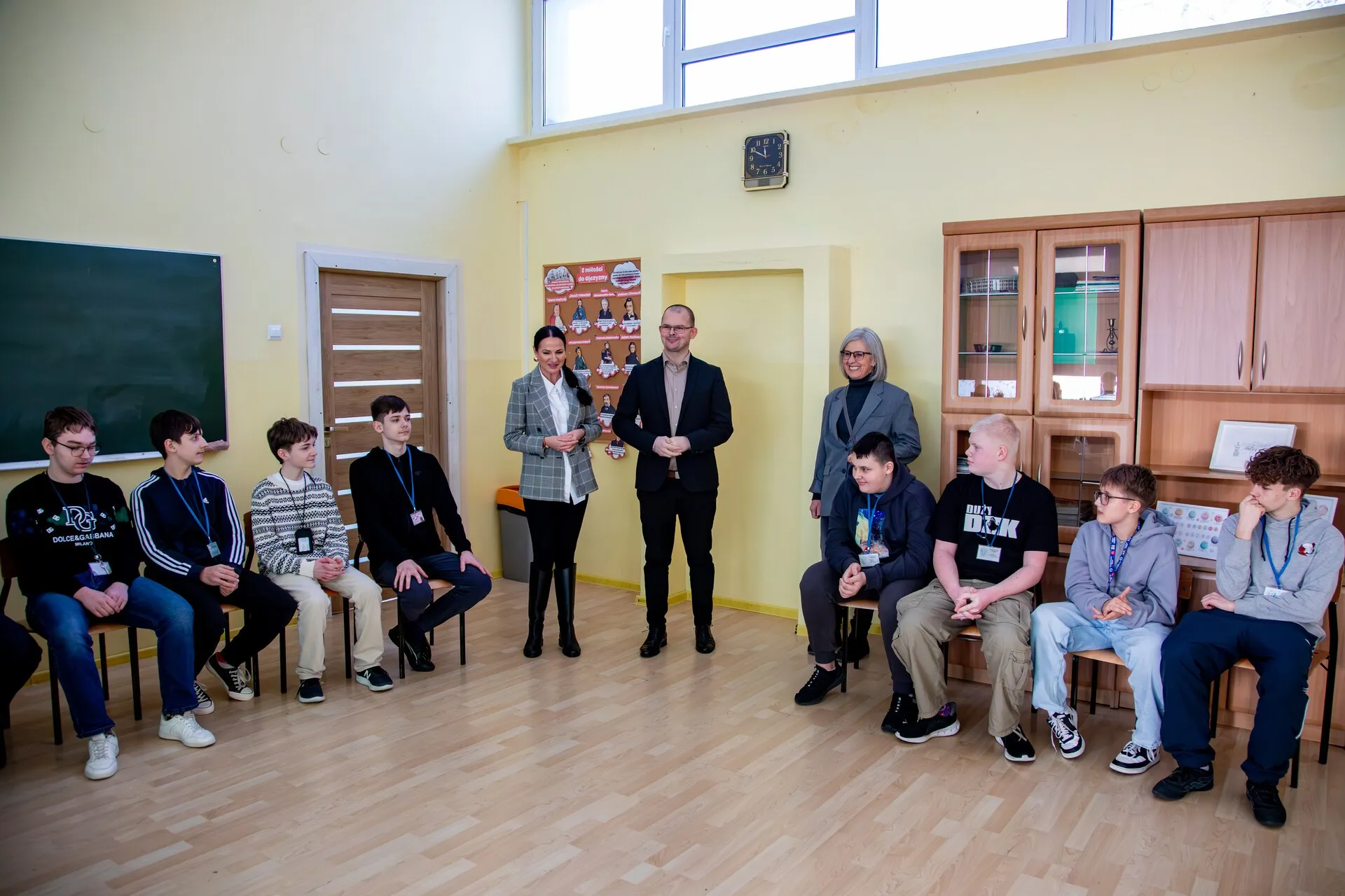 Wyjątkowa lekcja wiedzy obywatelskiej zakończyła się wspólnym zdjęciem uczniów z burmistrzem.