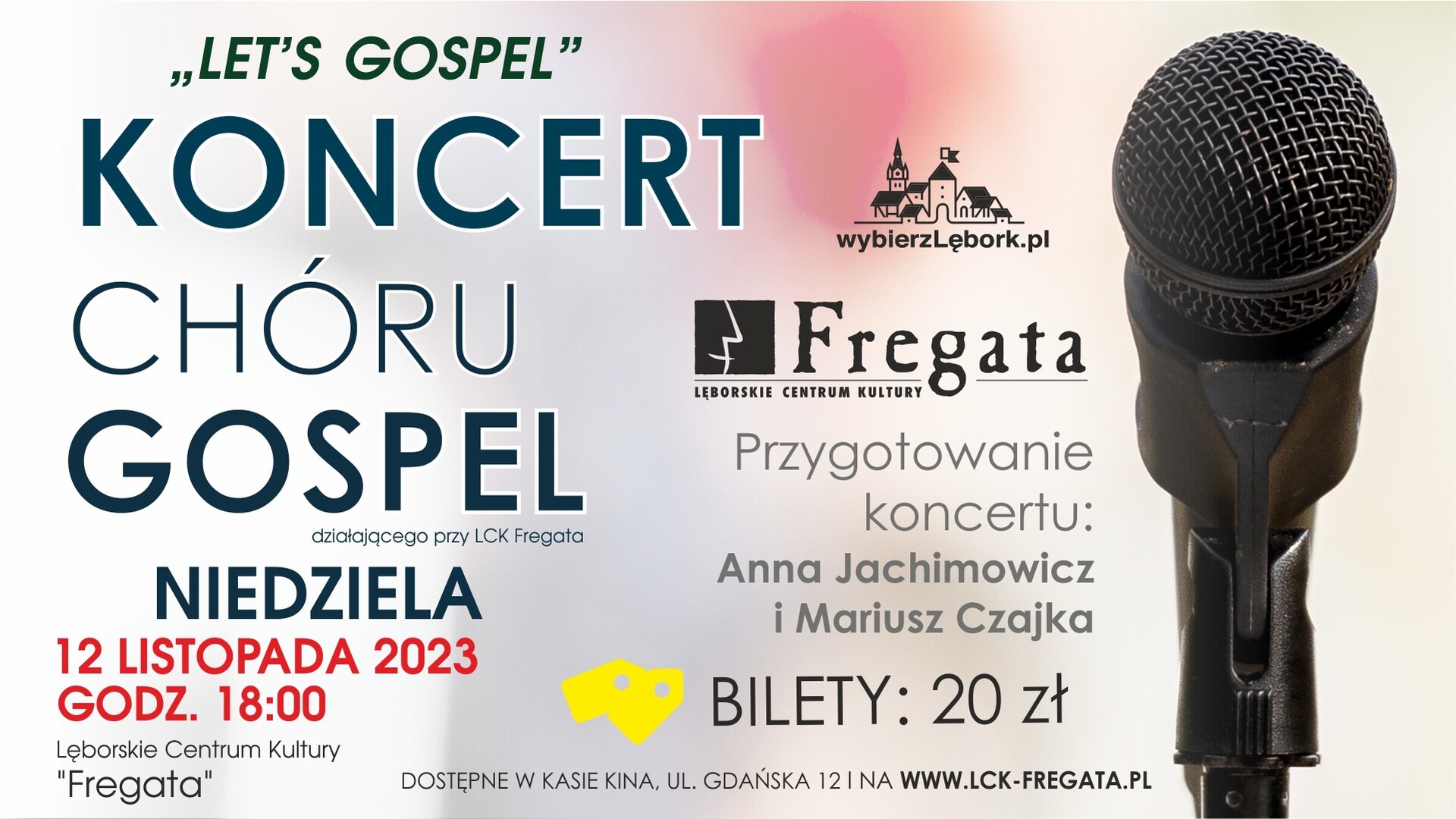 Lęborskie Centrum Kultury „Fregata” zaprasza w niedzielę, 12 listopada 2023 roku na godzinę 18.00, do Kina „Fregata” na inauguracyjny, pierwszy koncert Chóru Gospel Lębork pod hasłem "LET'S GOSPEL". Bilety w cenie 20 złotych dostępne są w kasie Kina „Fregata” oraz za pośrednictwem strony www.lck-fregata.pl.