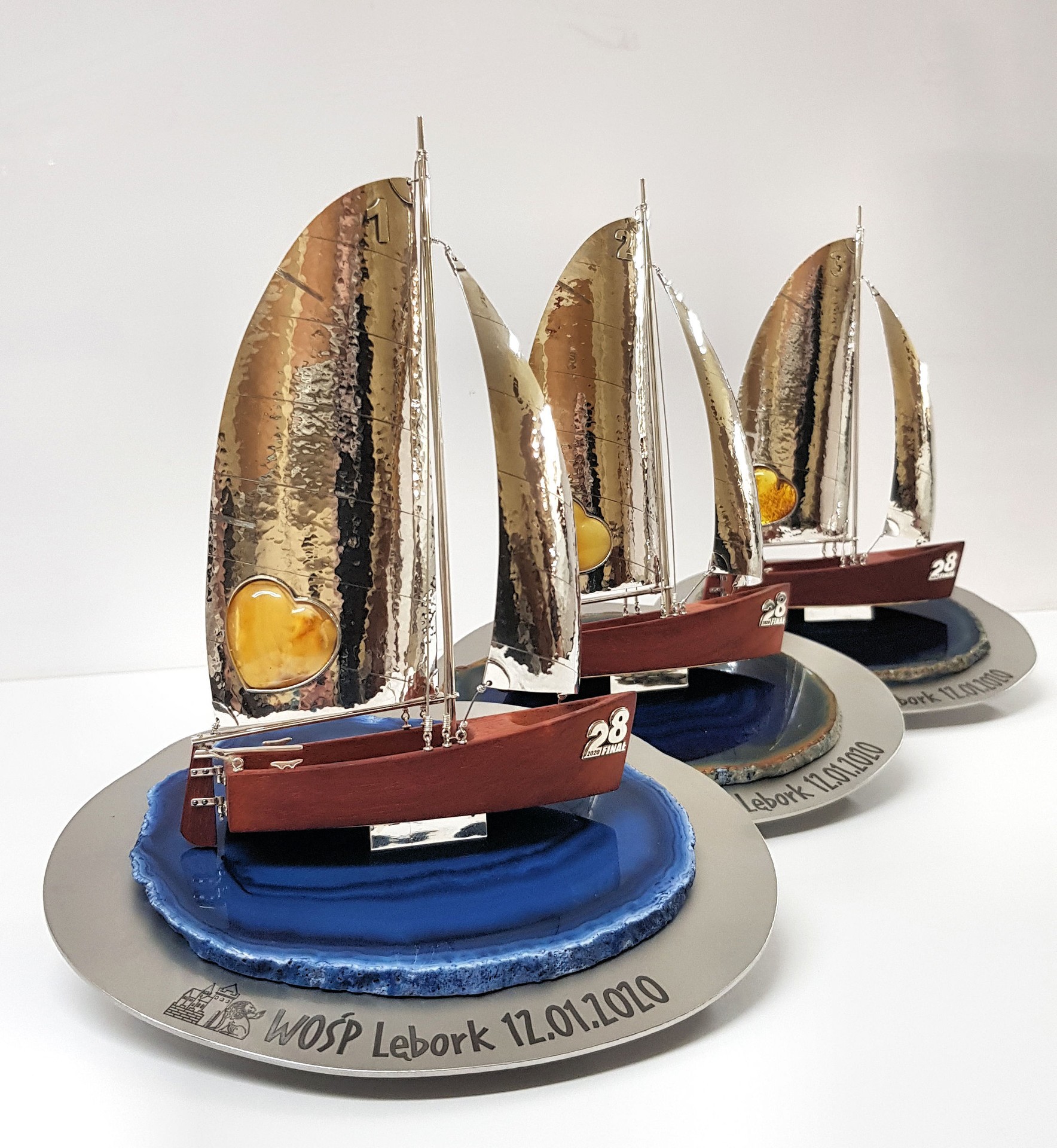 Kadłub wykonany został z egzotycznego afrykańskiego drewna padok o charakterystycznym czerwono-ceglastym kolorze. Drewno wykorzystywane jest w szkutnictwie, lutnictwie. Do wykonania żagli masztu, bomu, steru oraz olinowania użyto srebra w wysokiej próby Ag 0,925 wykorzystywanego w wyrobach jubilerskich. Łączna waga elementów srebrnych wynosi ok. 55 gram. Wymiary żaglówki bez podstawy: dł. 100 mm, szer. 30 mm, wys. 170 mm. Na burcie widnieje srebrne logo 28. Finału WOŚP. Główny żagiel ozdabia bursztynowe serce o wymiarach 30/25 mm. Serce wykonano z naturalnego bursztynu bałtyckiego. Żaglówka spoczywa na plastrze naturalnego agatu przymocowanego do podstawy wykonanej ze szlachetnej stali nierdzewnej.