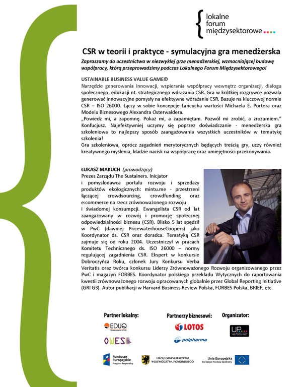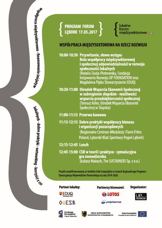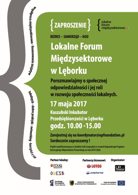 W imieniu Organizatorów - Urzędu Marszałkowskiego Województwa Pomorskiego, Fundacji Inicjowania Rozwoju UP Foundation i Stowarzyszenia EDUQ zapraszamy do uczestnictwa 17 maja 2017 w godz. 10-15 w LOKALNYM FORUM MIĘDZYSEKTOROWYM pod hasłem "Porozmawiajmy o społecznej odpowiedzialności i jej roli w rozwoju społeczności lokalnych". Miejsce Kaszubski Inkubator Przedsiębiorczości STOLEM w Lęborku godz. 10-15.