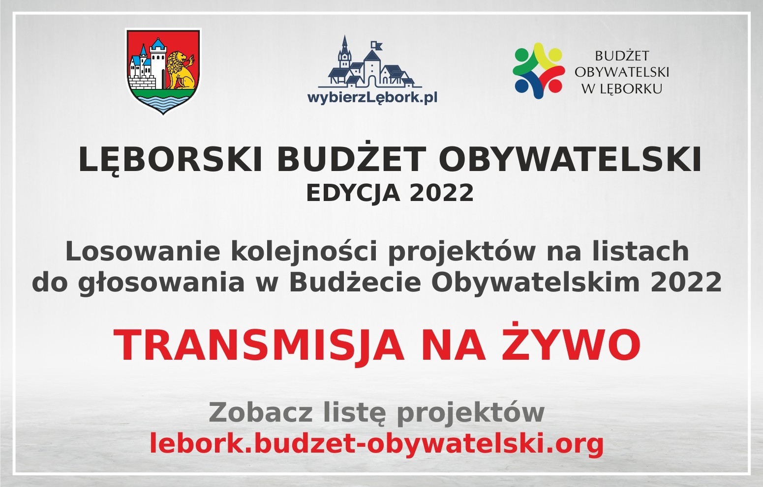 Burmistrz Miasta informuje mieszkańców oraz wnioskodawców projektów złożonych do Budżetu Obywatelskiego w Lęborku na 2022 rok o publicznym losowaniu kolejności projektów na Listach projektów do głosowania.