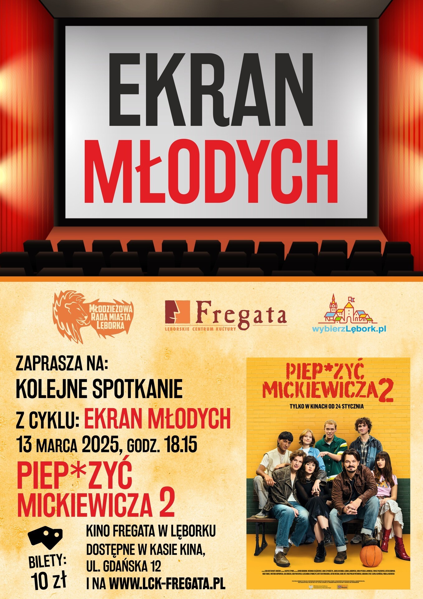 Lęborskie Centrum Kultury "Fregata" i Młodzieżowa Rada Miasta Lęborka zapraszają na marcowe spotkanie z cyklu "Ekran Młodych". W czwartek, 13 marca 2025 roku odbędzie się seans filmu "Piep*zyć Mickiewicza 2". Początek seansu o godzinie 18:15.