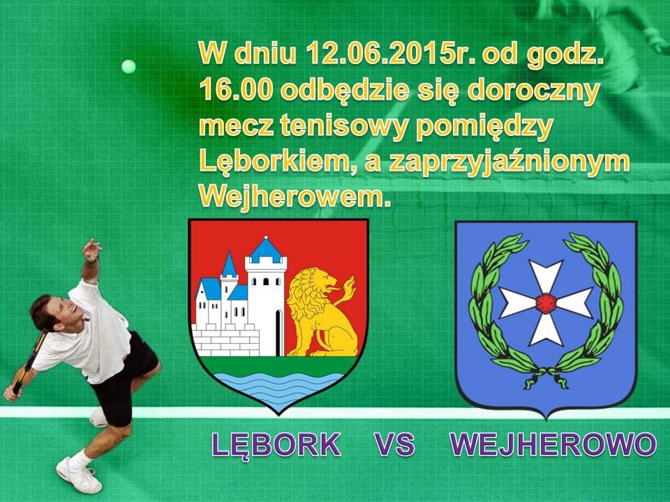 W dniu 12.06.2015 r. od godz. 16.00 odbędzie się doroczny mecz tenisowy pomiędzy Lęborkiem, a Wejherowem. W meczu weźmie udział po 10 zawodników i 3 zawodniczki z każdego miasta. Przewidziane jest rozegranie 13 meczy singlowych oraz 4 meczy deblowych. Konfrontacja naszych miast zapowiada się interesująco, tym bardziej, że wszystkie poprzednie mecze były zawsze zacięte.