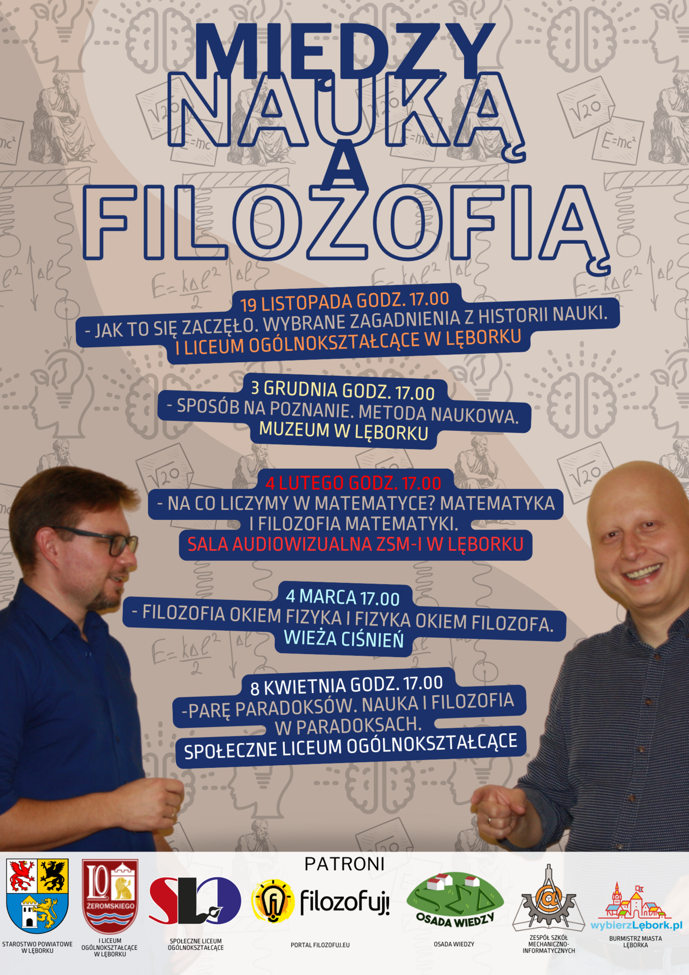 Pewnie każdy z Was wie czym jest biologia, znacie kilka wzorów z fizyki, umiecie wykonać działania matematyczne. Zastanawialiście się jednak czym jest życie, dlaczego fizyka działa, co tak naprawdę dodajecie w matematyce? Kamil Kostrzewa i Wojciech Malicki chcą zaprosić Was na cykl spotkań na temat nauki i filozofii prowadzony w przystępnej i humorystycznej formie. Ma on na celu przybliżenie wybranych zagadnień z historii nauki i filozofii, oraz ich pogranicza. Postarają się odpowiedzieć na pytania: Skąd pochodzi nauka? Czym nauka jest, a czym nie jest? Jak poprawnie prowadzić wartościowe badania? Jak zostać naukowcem bez fachowego wykształcenia? Czym różni się nauka od pseudonauki? Jaka jest rola nauki i filozofii we współczesnym świecie?