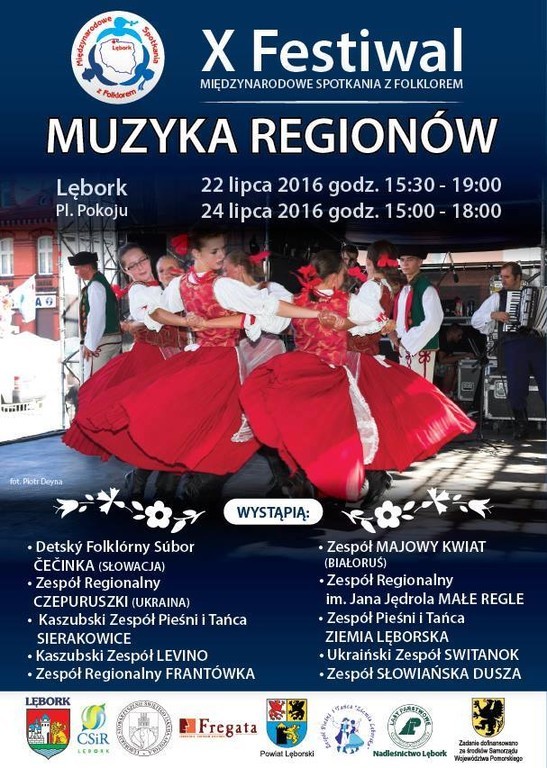 W tym roku na scenie wystąpi dziewięć zespołów. Nasz region reprezentować będą: Kaszubski Zespół Regionalny LEVINO, Zespół Pieśni i Tańca ZIEMIA LĘBORSKA, Zespół Regionalny FRANTÓWKA oraz Kaszubski Zespół Pieśni i Tańca SIERAKOWICE. Folklor górali podhalańskich zaprezentuje Zespół Regionalny im. Jana Jędrola MAŁE REGLE z Poronina. Swój program przedstawi też Ukraiński Zespół SWITANOK z Lęborka.