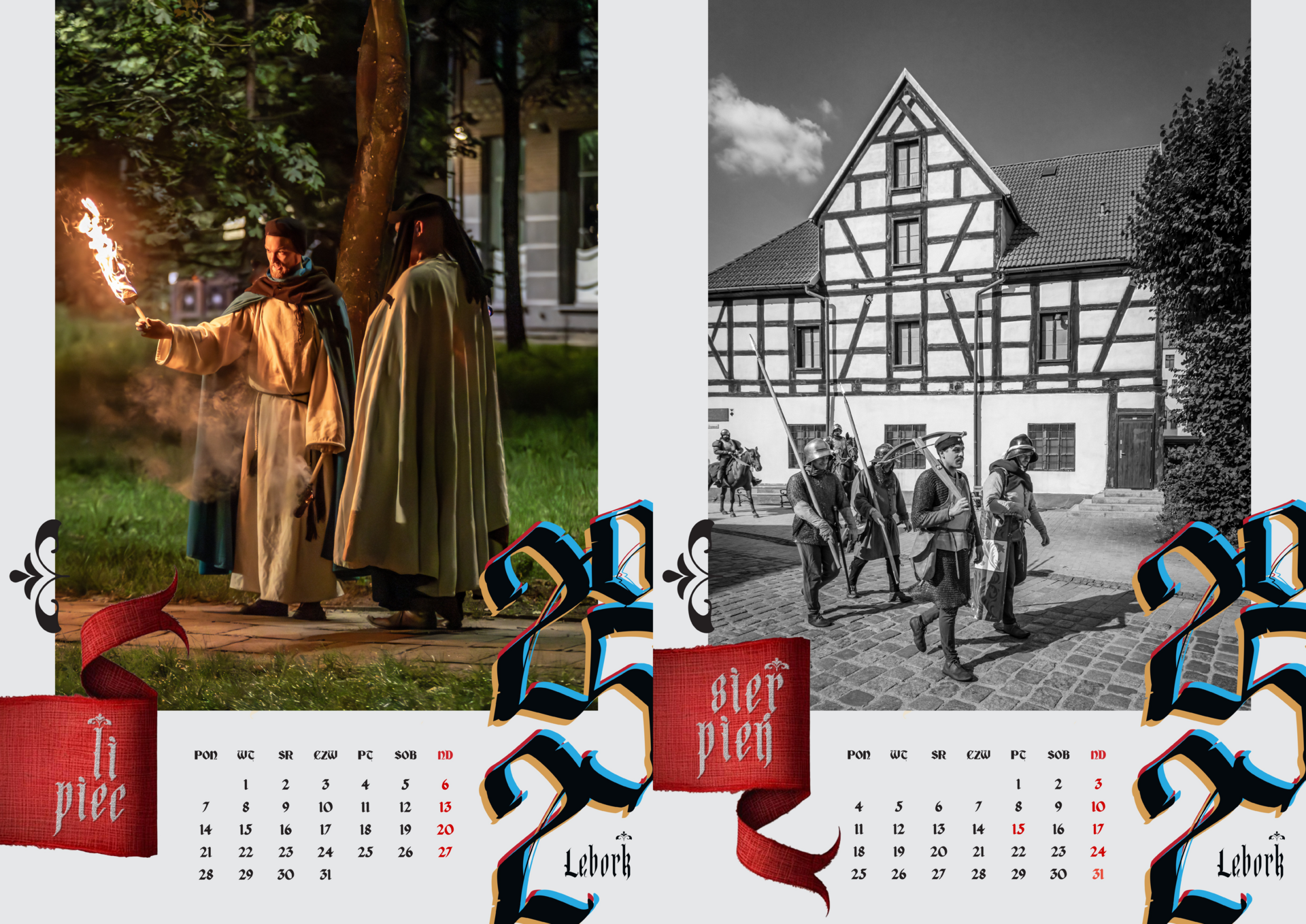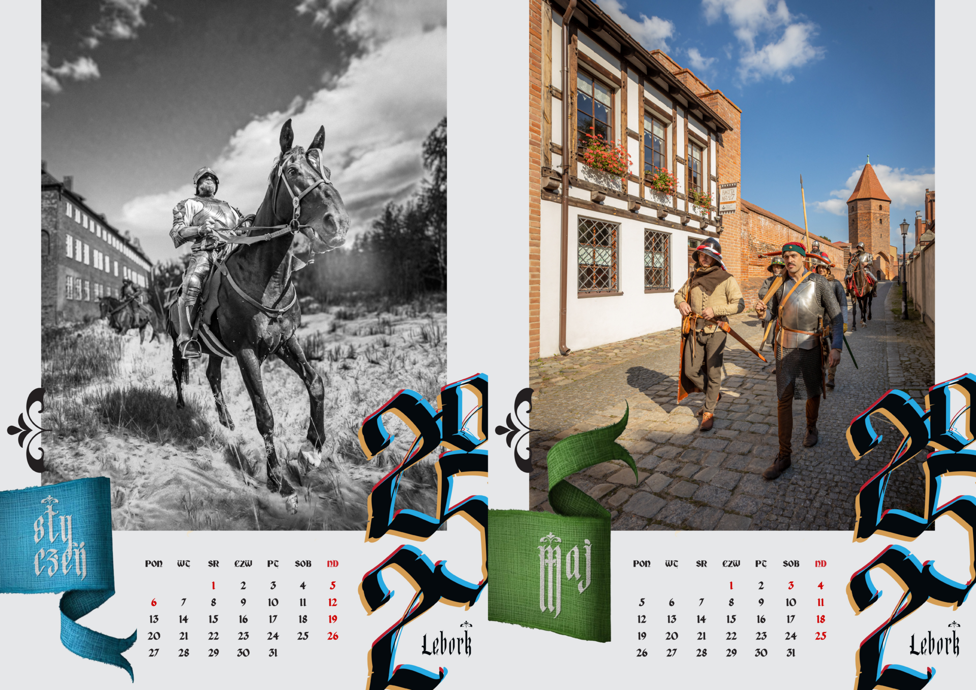 W wykonanie kalendarza na 2025 rok zaangażowali się członkowie i przyjaciele rekonstrukcyjnego ramienia Lęborskie Bractwo Historyczne. We wrześniowe weekendy w różnych miejscach Lęborka można było natknąć się na zdjęciowe sesje z udziałem rycerzy i rekonstruktorów okresu średniowiecza, koni, wozu i przedmiotów sprzed wieków.