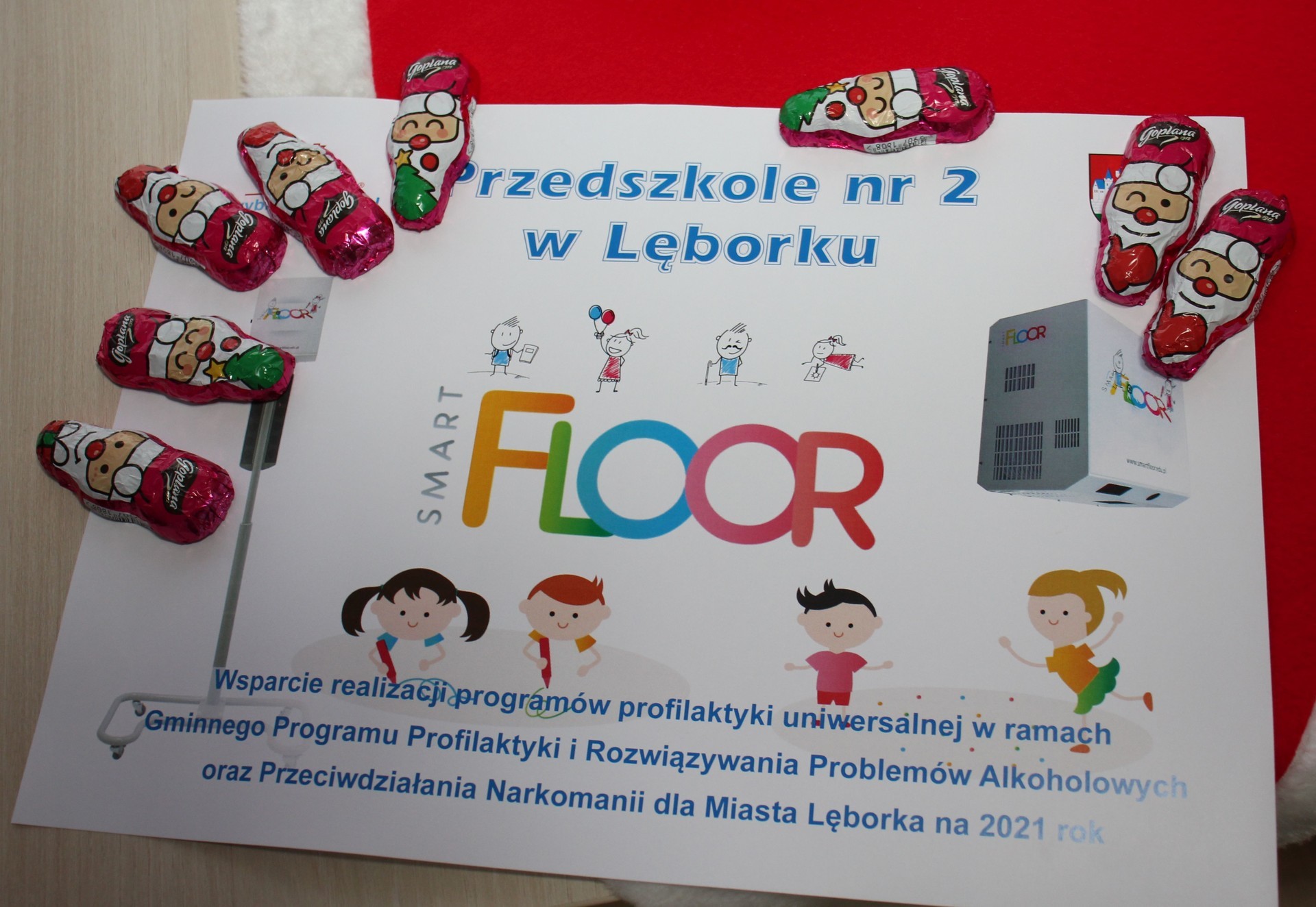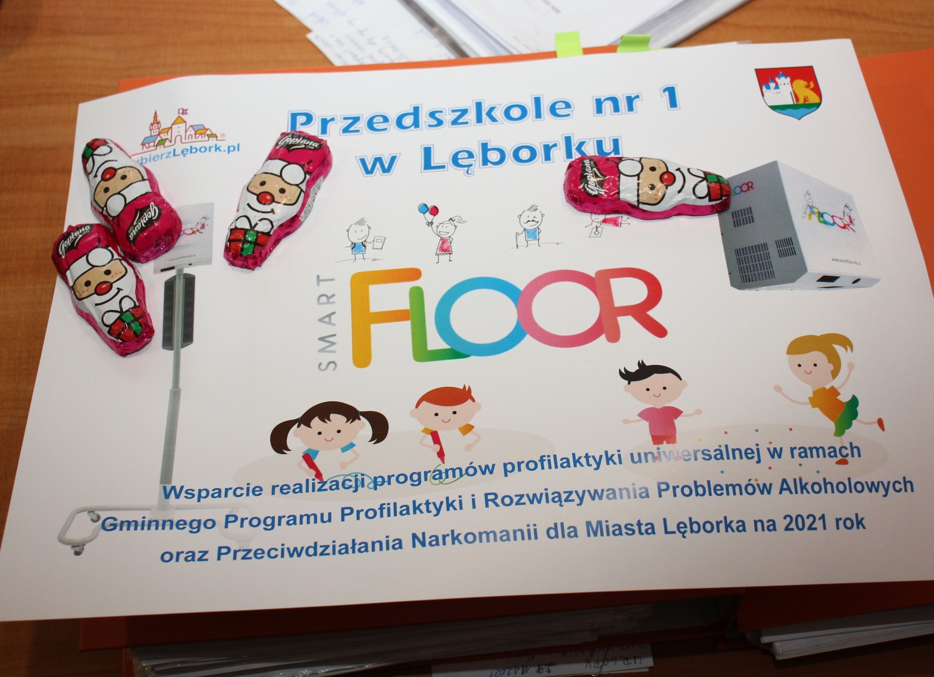 Wszystkie publiczne przedszkola w Lęborku a więc przedszkola nr 1, 2, 5, 6, 9 i 10 otrzymają w tym tygodniu piękny prezent, nowoczesne podłogi interaktywne SMART FLOOR. Urządzenia warte po kilkanaście tysięcy każde zostały zakupione z Gminnego Programu Profilaktyki i Rozwiązywania Problemów Alkoholowych oraz Przeciwdziałania Narkomanii. Z dobrą wiadomością przedszkola nr 1 i 2 odwiedził w Mikołajki Burmistrz Lęborka Witold Namyślak oraz Sekretarz Miasta Marian Kurzydło. Dla przedszkolaków nie zabrakło oczywiście słodkości.