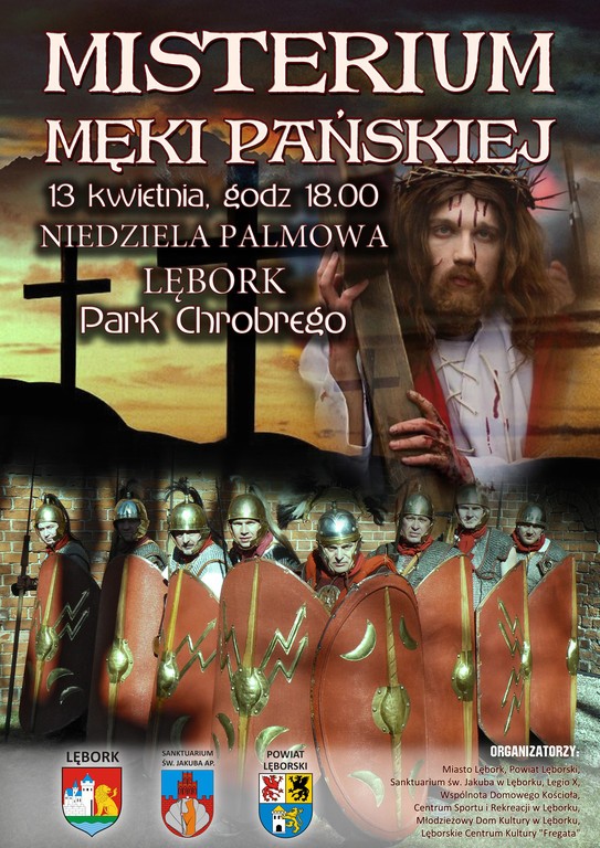 W Niedzielę Palmową 13 kwietnia 2014r. o godz. 18.00 w Parku Chrobrego odbędzie się Misterium Męki Pańskiej, na którą zapraszają mieszkańców Lęborka organizatorzy: Miasto Lębork, Sanktuarium Św. Jakuba Ap., Powiat Lęborski, Legio X, Wspólnota Domowego Kościoła, CSiR w Lęborku, Młodzieżowy Dom Kultury, LCK „Fregata”.