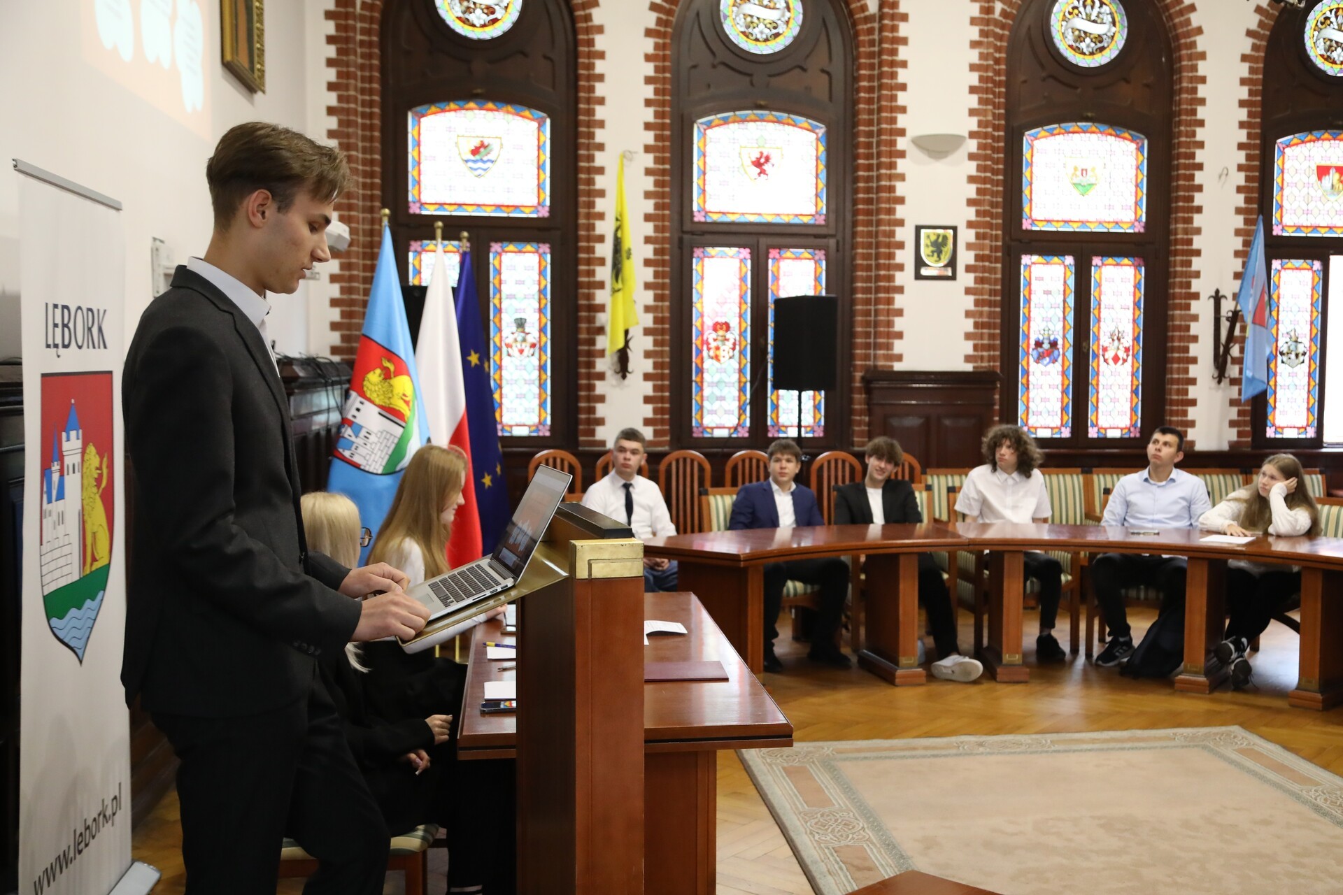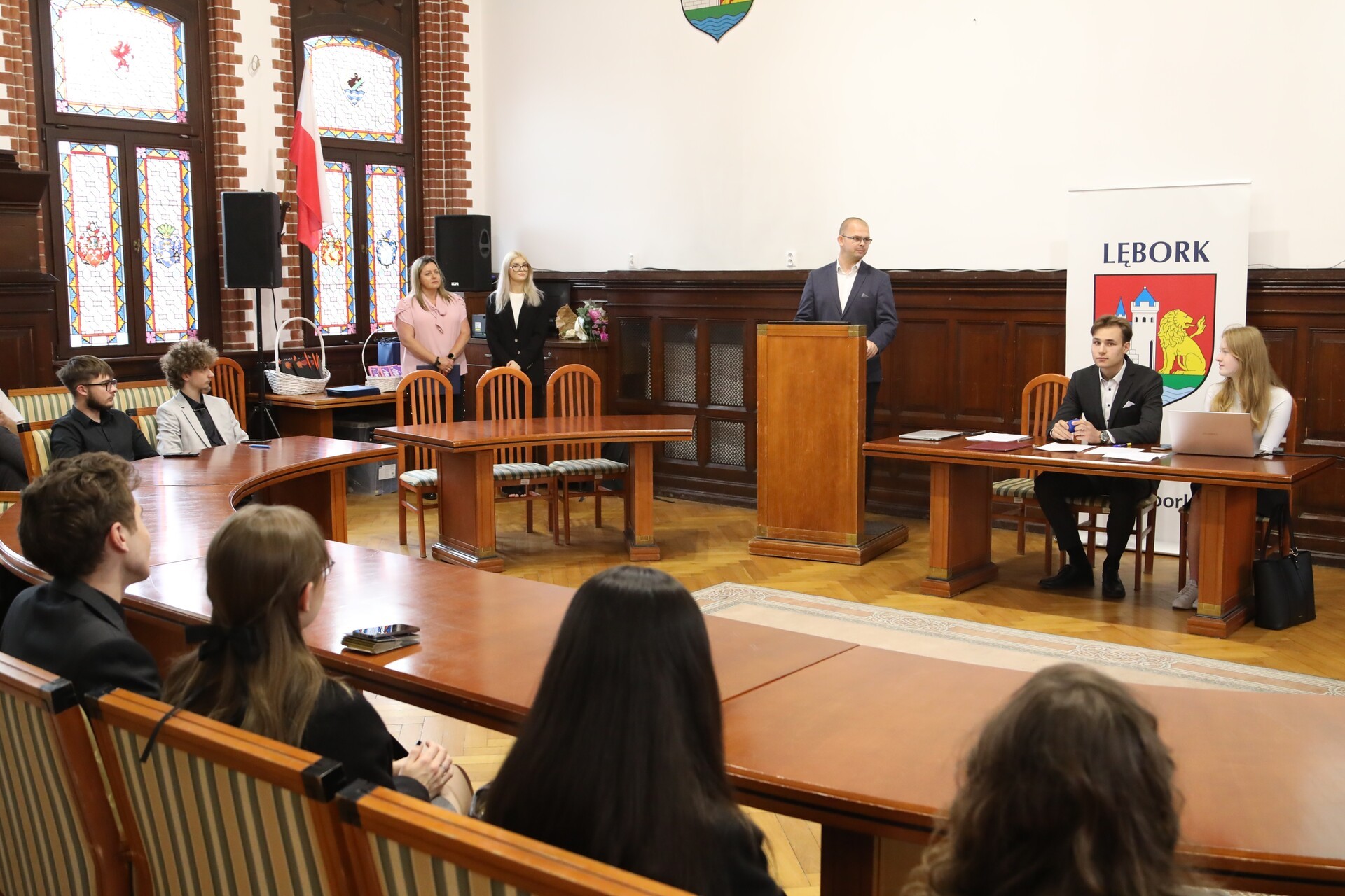W ratuszu odbyła się ostatnia sesja V kadencji Młodzieżowej Rady Miasta Lęborka. Przewodniczący Rady Patryk Erni w krótkiej prezentacji podsumował działalność rady w kadencji 2023 - 2025. Głos zabrał również burmistrz miasta, który wręczył radnym podziękowania i drobne upominki.