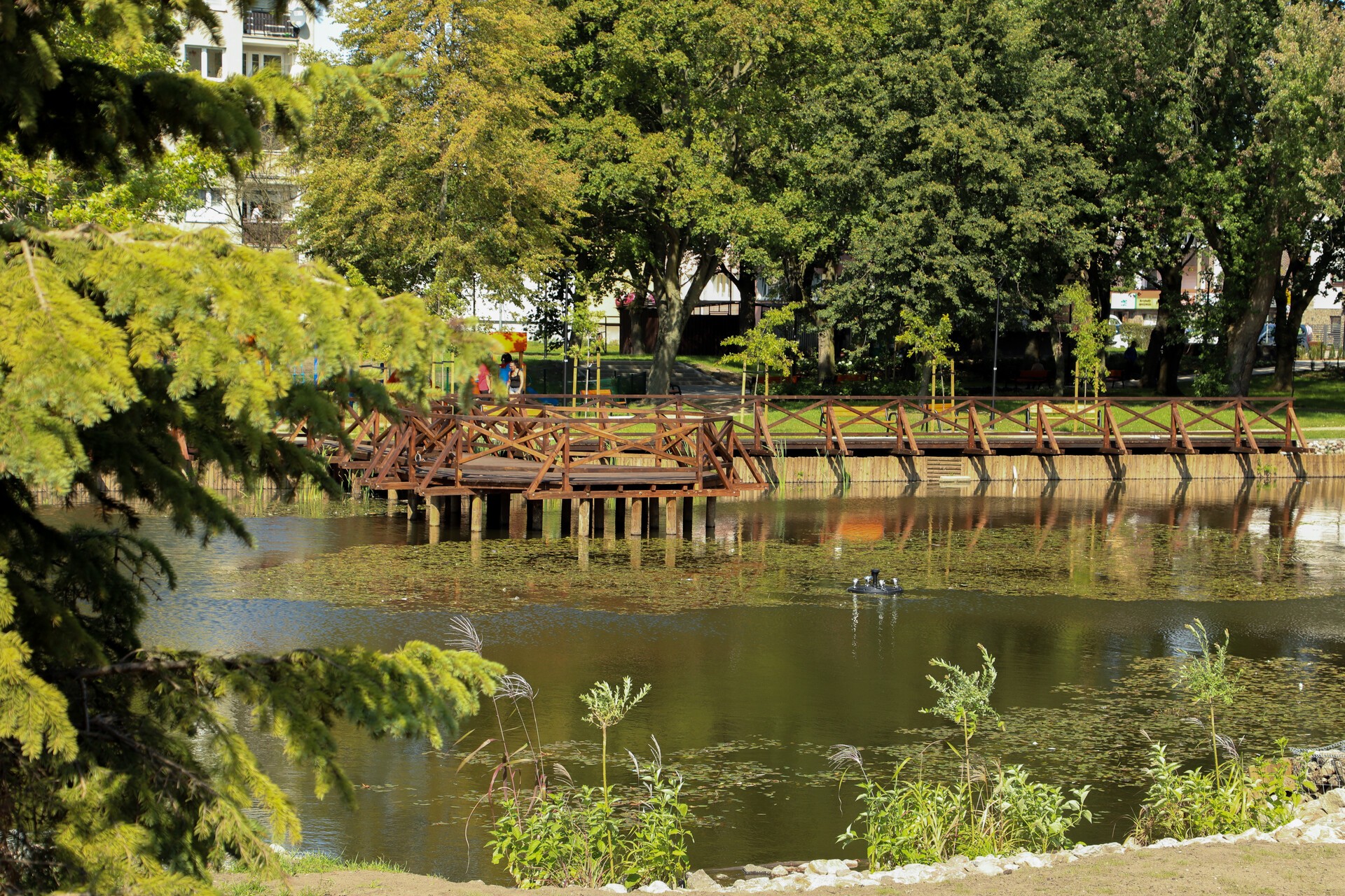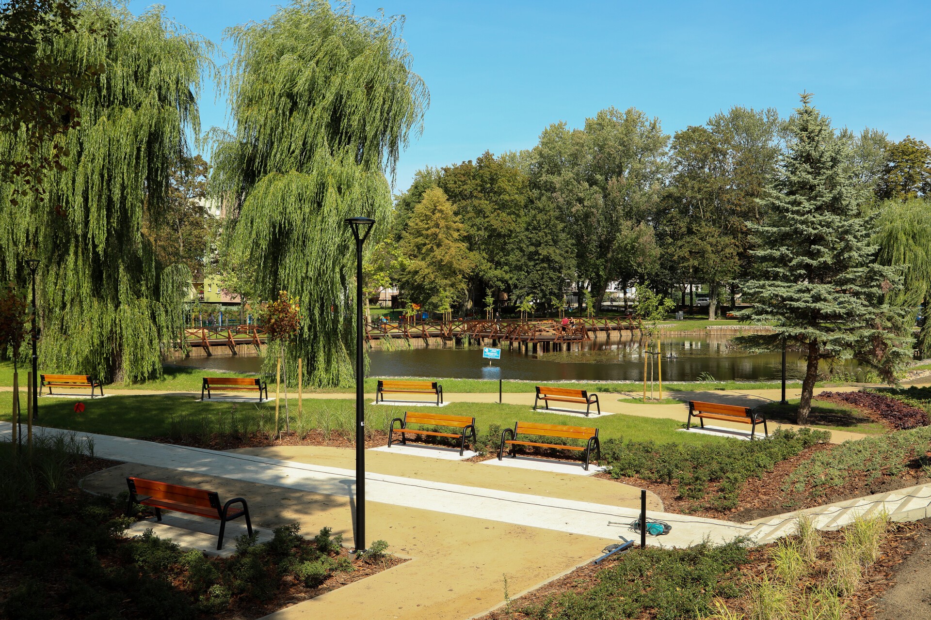W parku pojawiły się nowe kosze na odpady, stojaki rowerowe i oświetlenie. Na środku stawu zamontowano pływającą fontannę z kolorowym wieczorno-nocnym podświetleniem. W ramach rewitalizacji wybudowano także przepompownię wód opadowych tłoczącą wodę ze stawu do kanalizacji deszczowej.