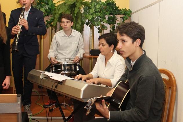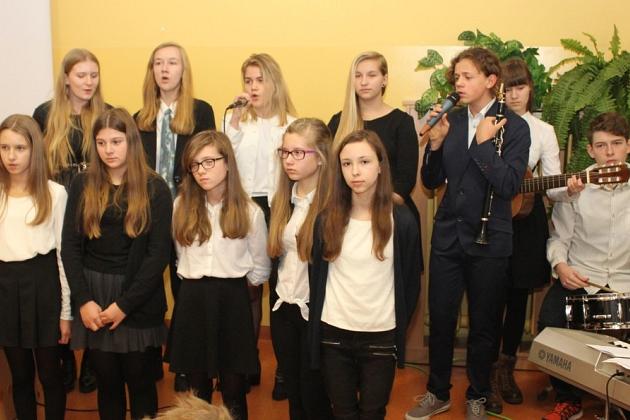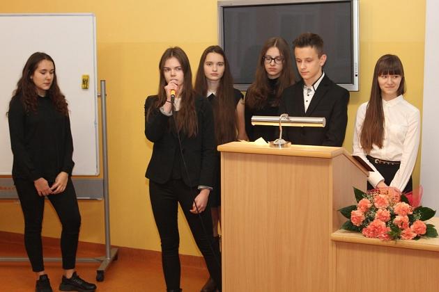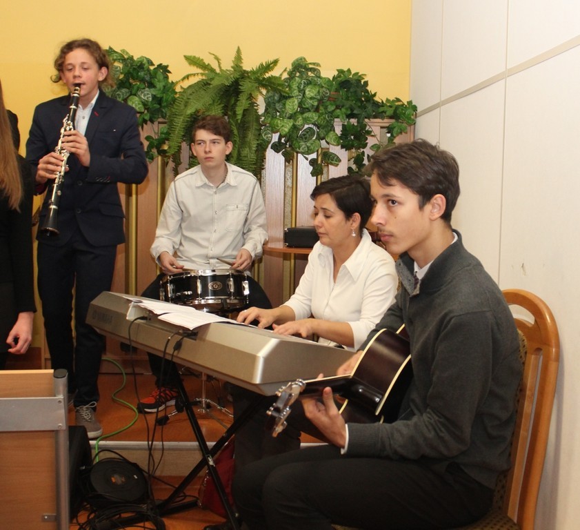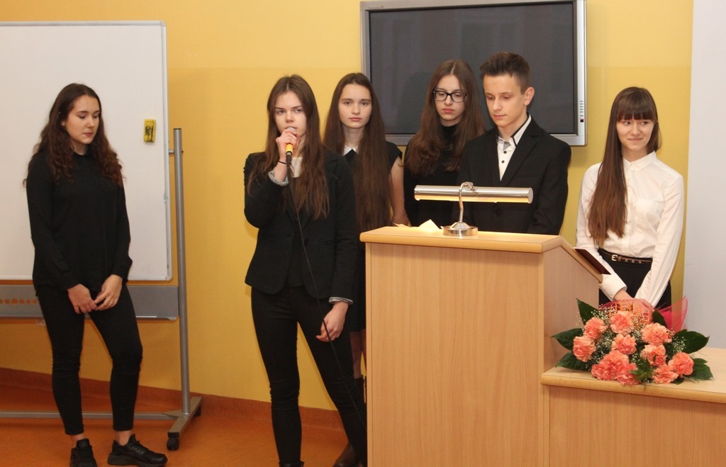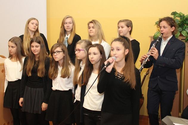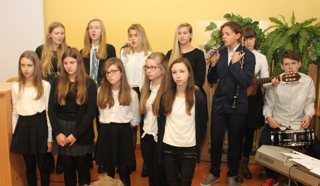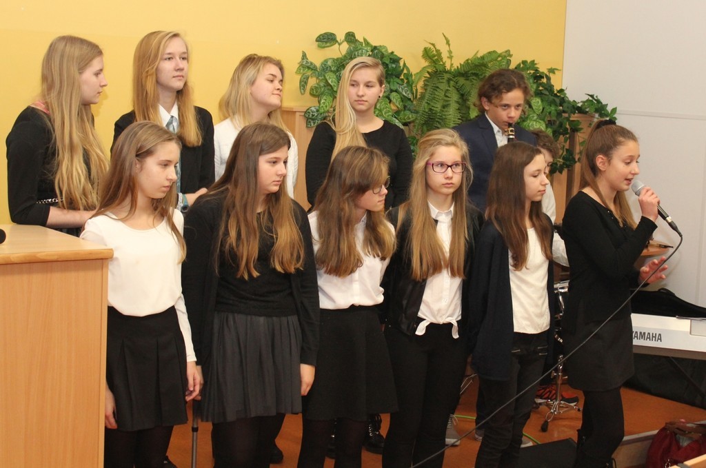 Wykład poprzedził patriotyczny występ – Chóru i uczniów Społecznego Gimnazjum Językowego w Lęborku. Młodzież, uczniów z SGJ do koncertu pieśni i piosenek patriotycznych przygotowały Panie Małgorzata Koss i Magdalena Krefft.
