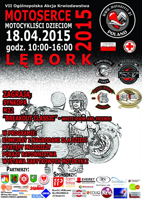 Klub Motocyklowy „Cruiseriders” MC Poland zaprasza na kolejną, 7. edycję akcji „MOTOSERCE”, która odbędzie się w sobotę 18 kwietnia 2015r. w godzinach 10.00-15.30 na Placu Pokoju w Lęborku.
