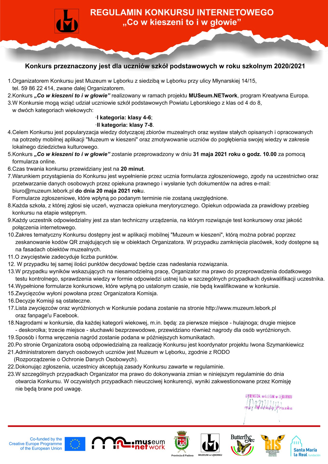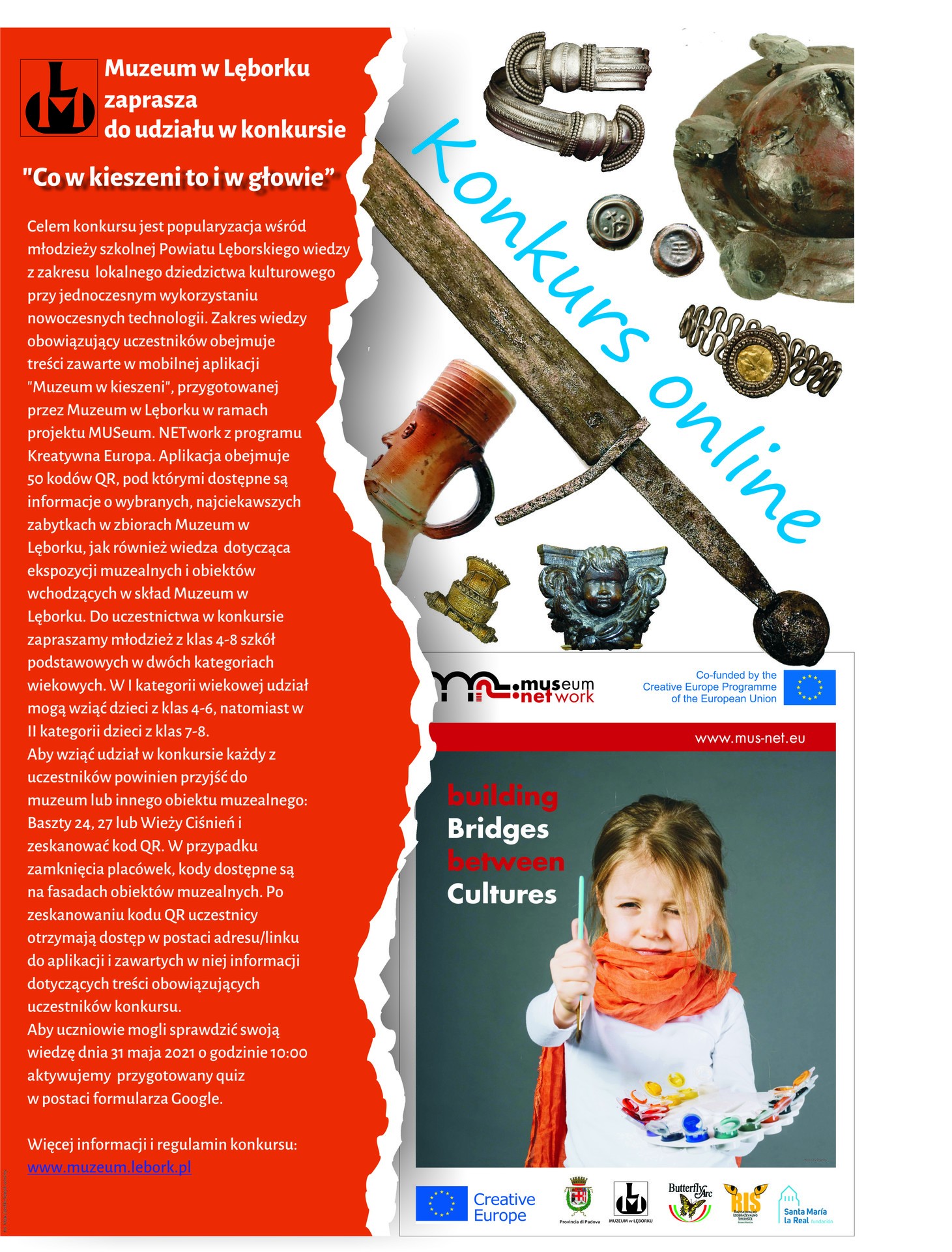 W związku ze stworzeniem przez Muzeum w Lęborku nowej aplikacji mobilnej „Muzeum w kieszeni” ułatwiającej indywidualne zwiedzanie, a także zamiarem popularyzacji wiedzy zawartej w aplikacji, Muzeum zaprasza młodzież szkolną z klas 4-8 do wzięcia udziału w konkursie „Co w kieszeni to i w głowie”. Pierwsza kategoria wiekowa obejmuje uczniów z klas 4-6, druga - młodzież z klas 7-8.