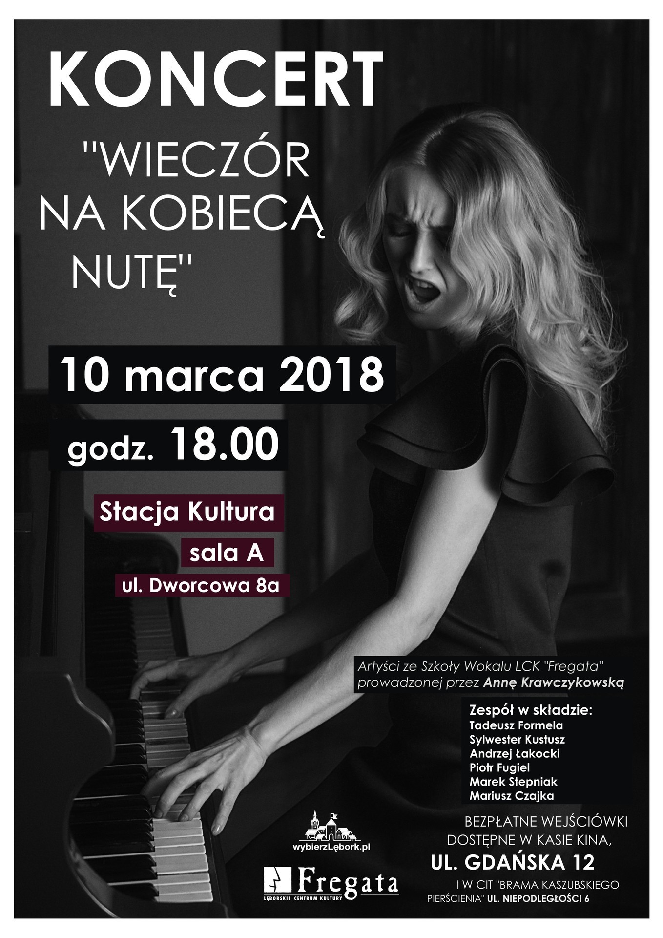 Lęborskie Centrum Kultury „Fregata” zaprasza w sobotę 10 marca 2018 roku do Stacji Kultura na koncert pod tytułem „Wieczór na kobiecą nutę”. Początek o godzinie 18:00.