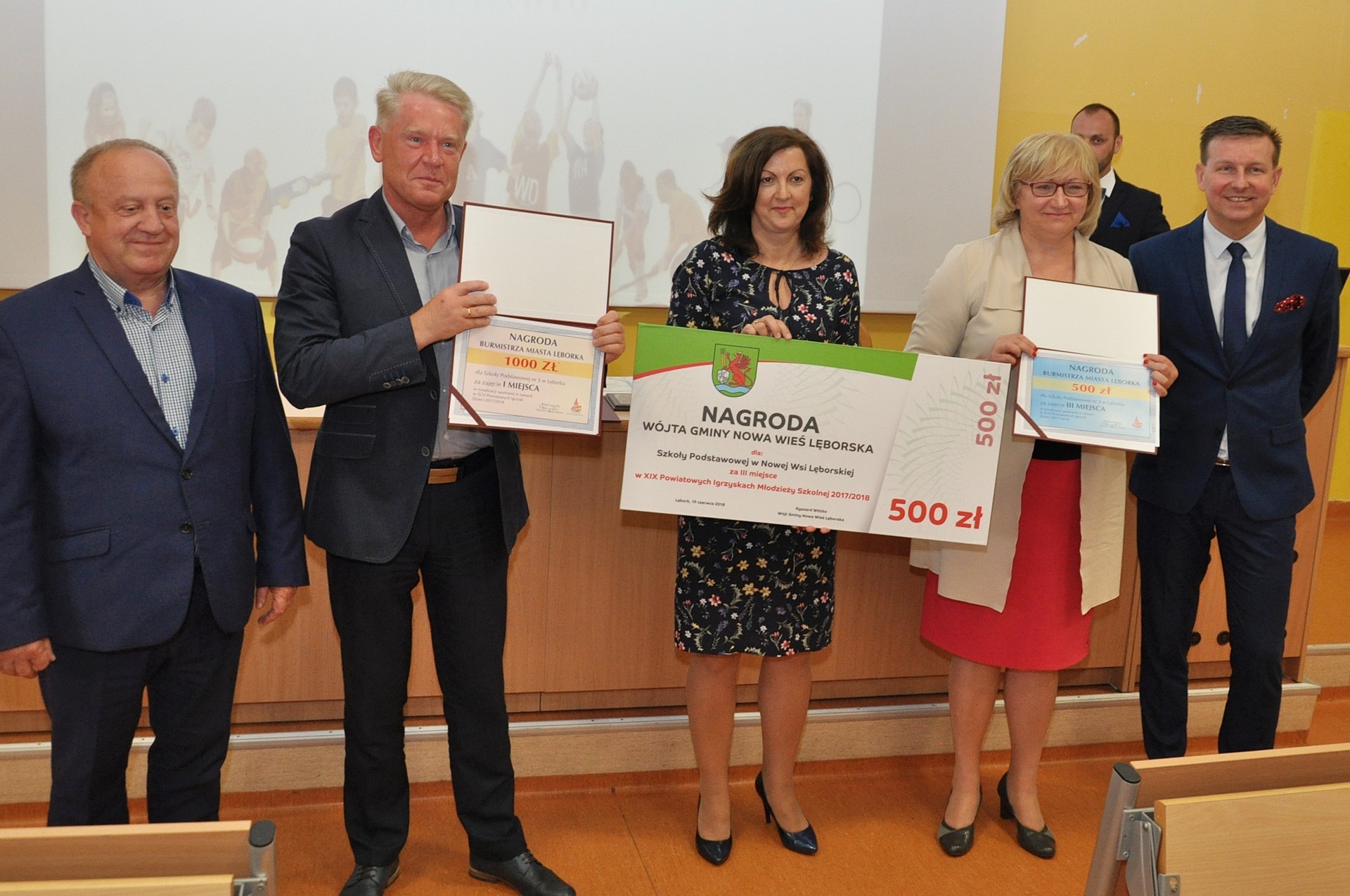 Wyróżnione szkoły podstawowe otrzymały nagrody w postaci „czeków” ufundowanych przez: Burmistrza Miasta Lęborka, Wójta Gminy Cewice oraz Wójta Gminy Nowa Wieś Lęborska. Szkoły ponadgimnazjalne i Specjalny Ośrodek Szkolno – Wychowawczy nagradzała Starosta Lęborski. Starosta nagrodziła także zawodników osiągających wysokie wyniki sportowe na szczeblu wojewódzkim i ogólnopolskim. Koordynatorom gminnym i miejskim zawodów sportowych wręczono pamiątkowe grawertony, a organizatorom zawodów powiatowych nagrody pieniężne ufundowane przez Starostę Lęborskiego.