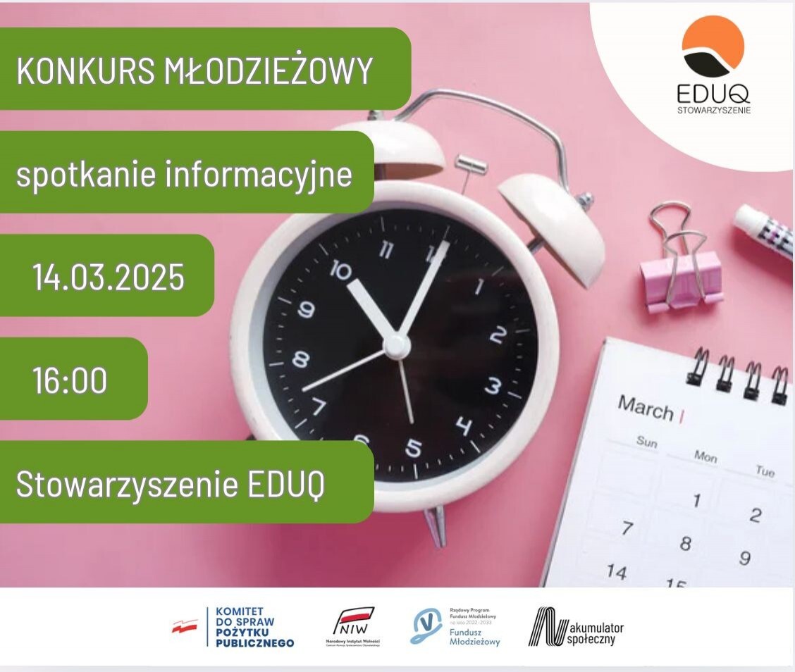 Stowarzyszenie EDUQ zaprasza na spotkanie informacyjne w sprawie konkursu grantowego „AKUMULATOR SPOŁECZNY 2025 - konkurs młodzieżowy”. Spotkanie odbędzie się w piątek 14 marca 2025 r., początek o godz. 16:00 w budynku PCPR, II piętro, pokój 305, ul. Okrzei 15 w Lęborku.