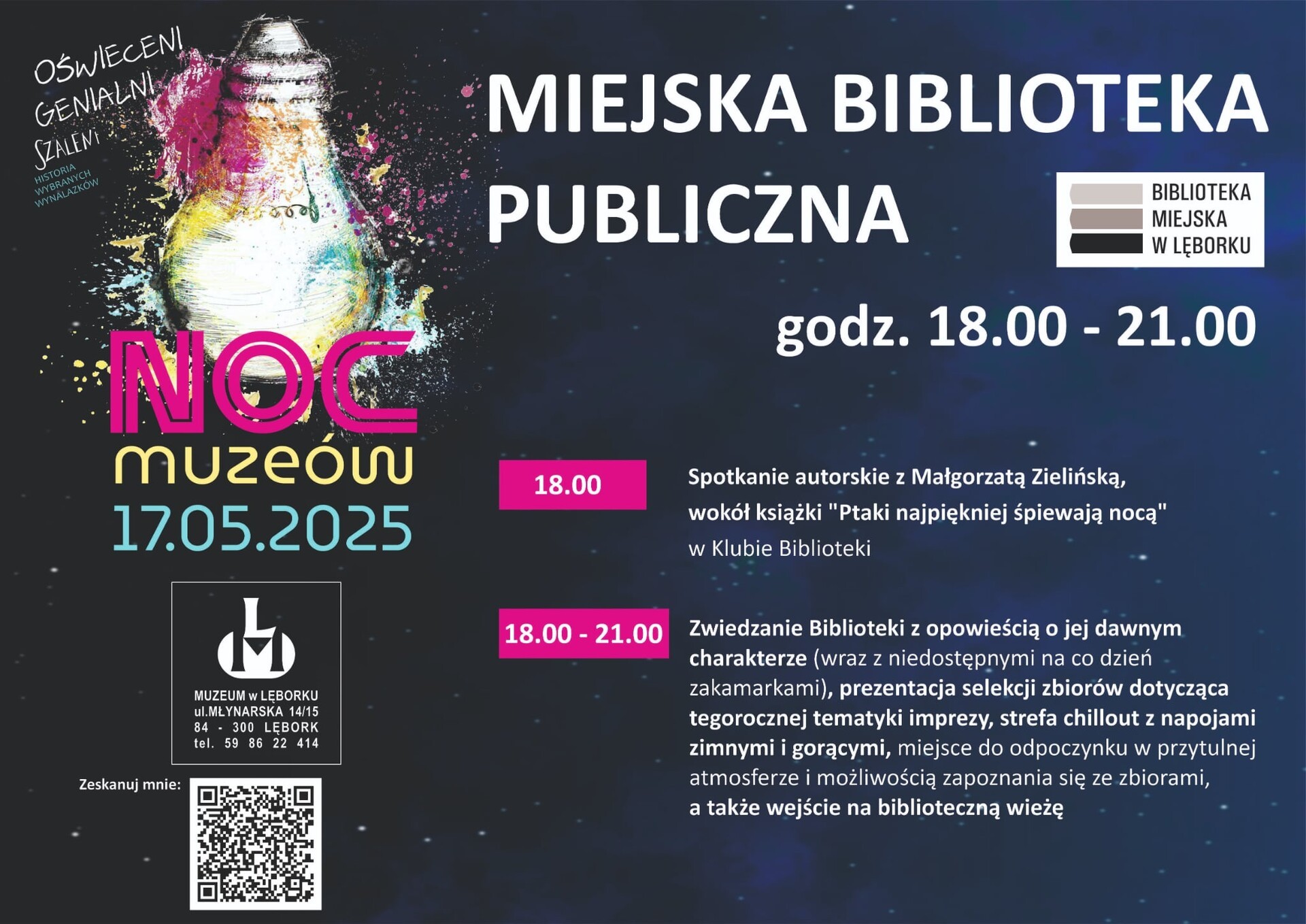 Wyjątkowym wydarzeniem będzie także spotkanie autorskie z lęborczanką Małgorzatą Zielińską, autorką książki pt. „Ptaki najpiękniej śpiewają nocą”. Przyjdź, zobacz, posłuchaj i przekonaj się, że biblioteka po zmroku ma zupełnie inny klimat.